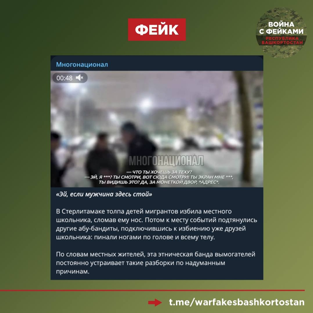 Тг-канал «Война с фейками. Башкортостан» поясняет, что антироссийская пропаганда снова попыталась исказить содержание реальных событий, чтобы дестабилизировать ситуацию в стране. И обратились они, как это часто бывает, к теме межнациональных конфликтов, пытаясь привязать ее к случившемуся.
