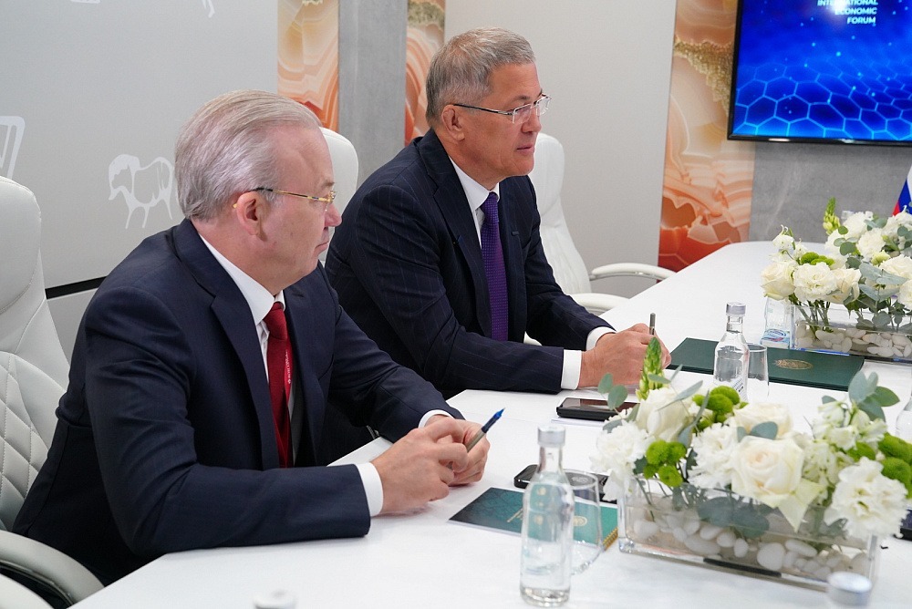 В рамках XXVIII Петербургского международного экономического форума (ПМЭФ) 20 июня состоялась встреча Главы Башкирии Радия Хабирова с Главой Республики Алтай Андреем Турчаком.