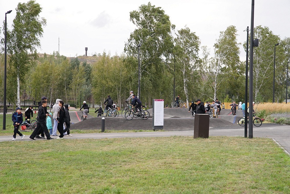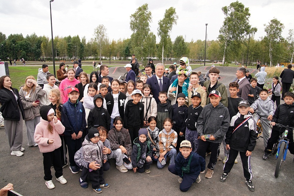 Радий Хабиров отметил, что из ранее заросшей и небезопасной территории парк превратился в современное пространство с дорожками, освещением, детскими и спортивными зонами.