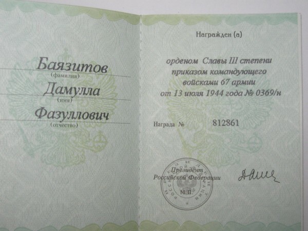 Сегодня, 2 декабря, в деревне Байгазино Бурзянского района Башкортостана большой праздник. Семье ныне покойного ветерана Великой Отечественной войны Дамуллы Фазулловича Баязитова вручили Орден Славы III степени. Эту почетную государственную награду Дамулле Баязитову присвоили еще в июле 1944 года за проявленный героизм в боях. Однако почему-то награда так и не нашла героя…
