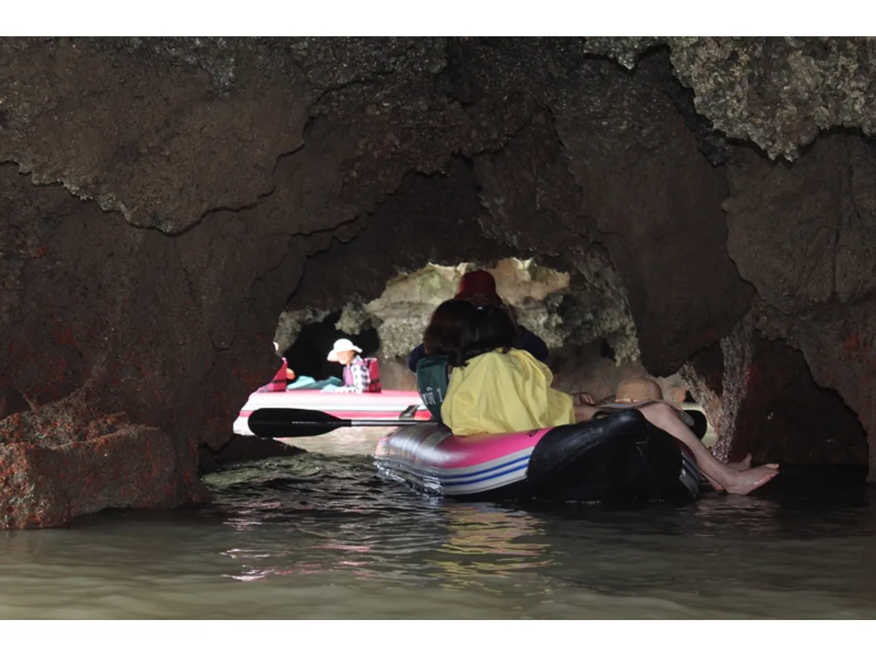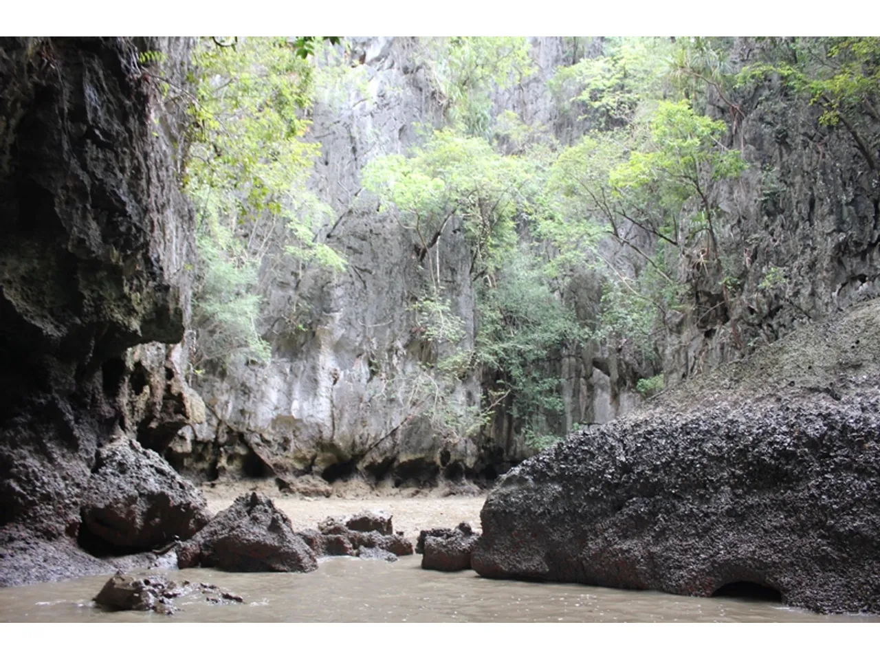 Далее – опять в лодку. Бодро плывем к лодочной базе. Там нас катают на надувных каноэ местные ребята. Я геройски прошу одноместное каноэ, но получаю отказ – такова техника безопасности. Мне дают двухместное. Свободы в нем больше - другие плавали в трех- и четырехместных. Заплыв еще больше впечатляет, чем национальная лодка с мотором. Проплываем под нависающими скалами, заплываем в пещеры и скрытые заводи, любуемся мангровыми зарослями. Внутри, в самой середине одного из островов – небольшое озерцо, окруженное скалами.