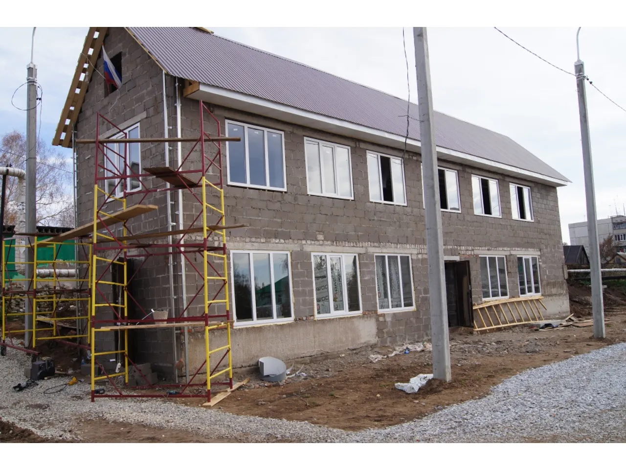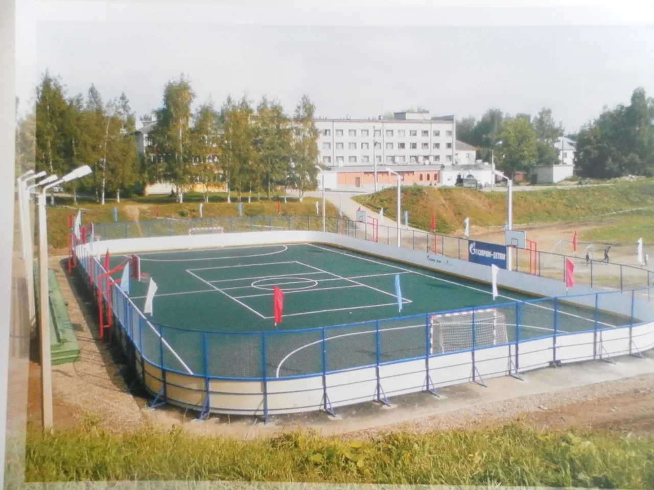 Возвели двухэтажное здание вплотную к хоккейной коробке, где на первом этаже – раздевалка, место хранения спортинвентаря, душевые и т.д., на втором планировалось обустроить учебный класс для мальчишек.