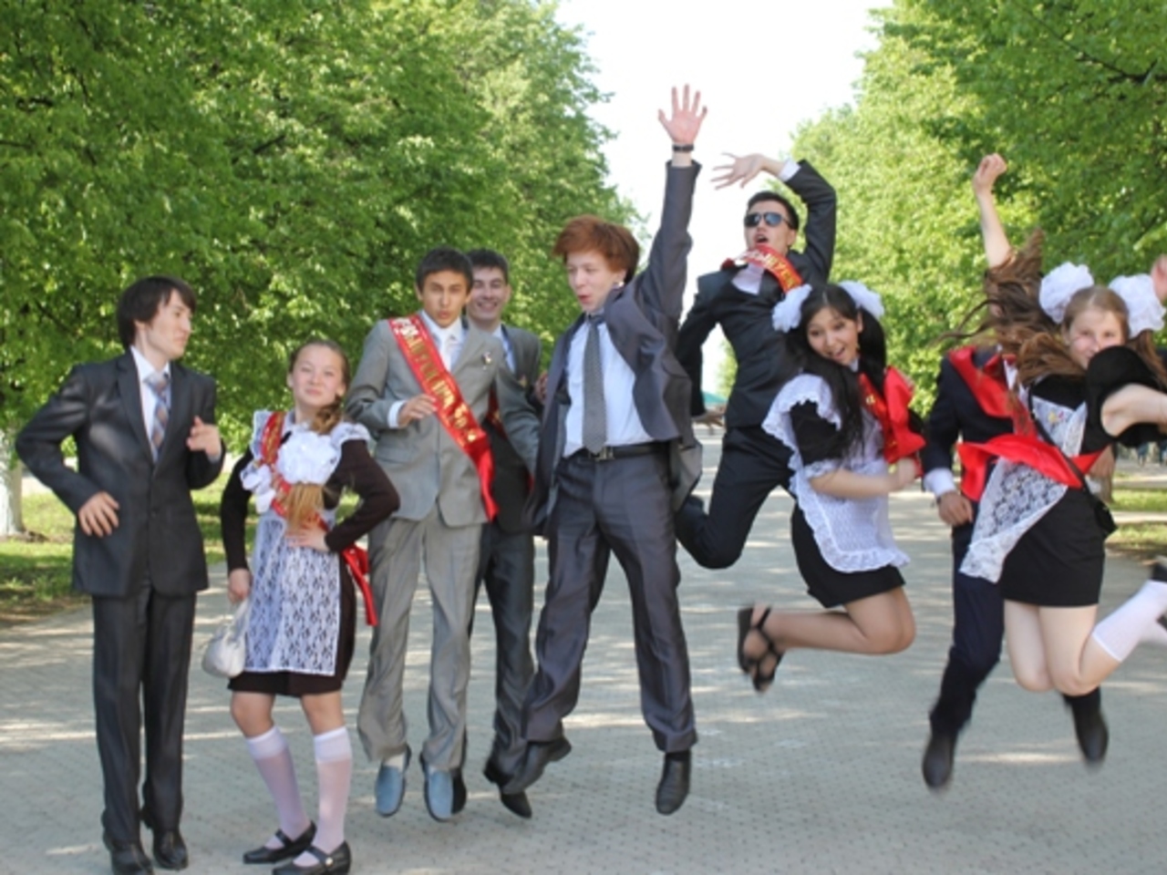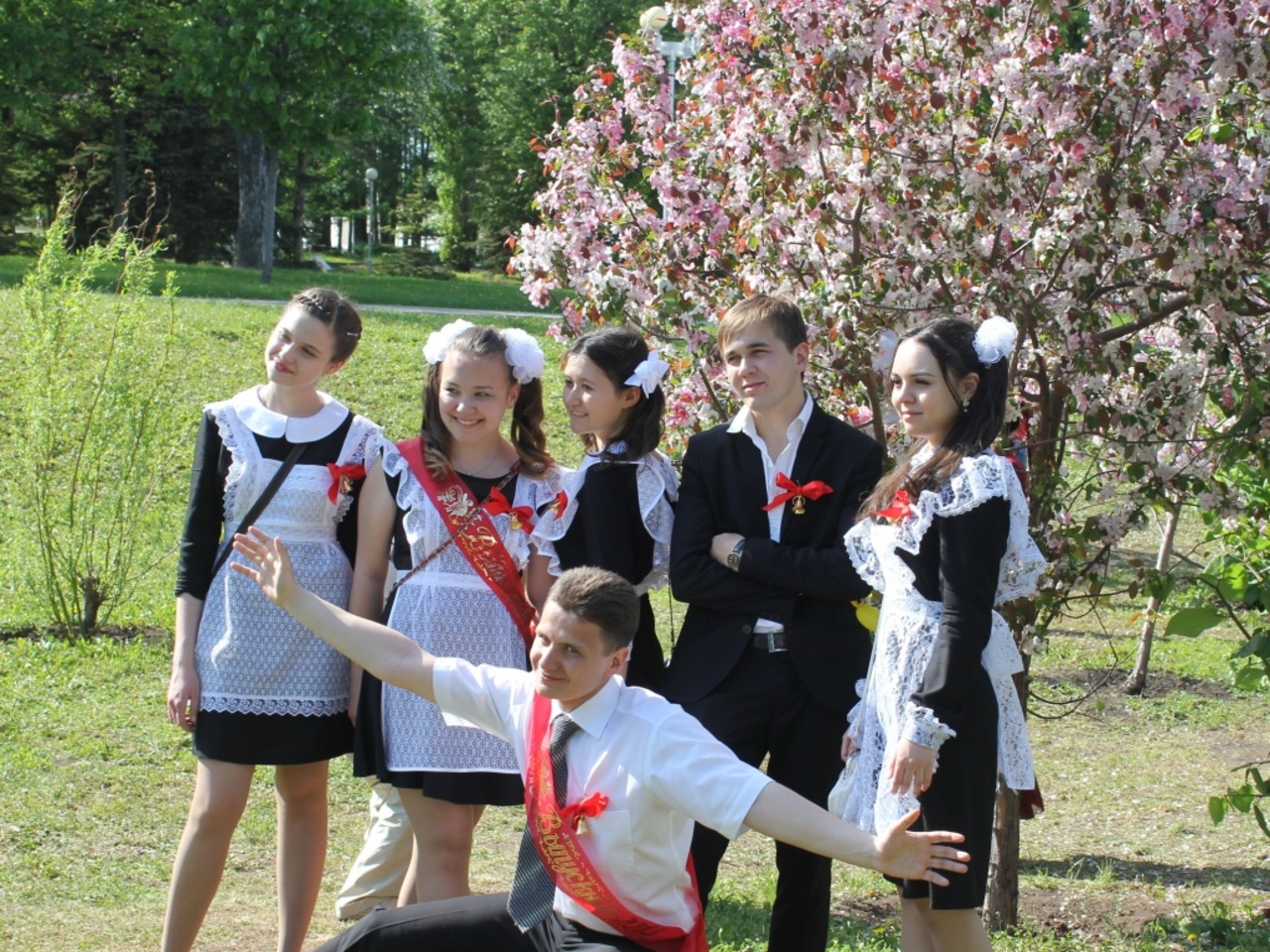 Однако большинство виновников торжества ограничились привычными пешими прогулками по улицам родного города. Такого красивого в эту майскую пору. Радостные школьники гуляли и фотографировались на память в цветущем парке имени Матросова, где по праздничному случаю включили фонтаны.