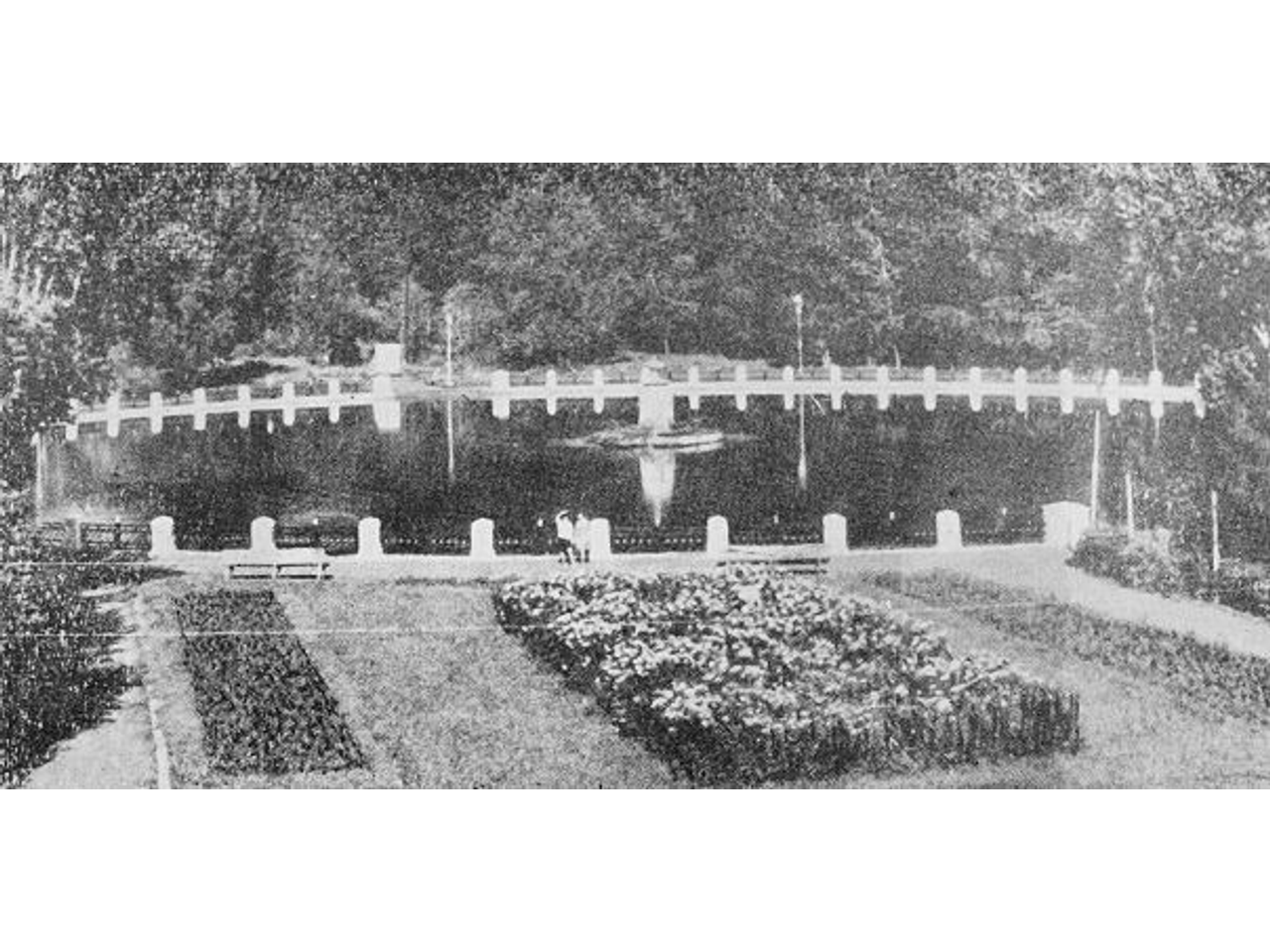 Как видим, в центральной его части находится искусственный водоем с фонтаном. Огорожено это гидротехническое сооружение ажурными металлическими решетками. Вблизи видны клумбы и тенистые аллеи. Неподалеку, как утверждают старожилы, располагались аттракционы для детей, летняя эстрада и другие атрибуты паркового зодчества.