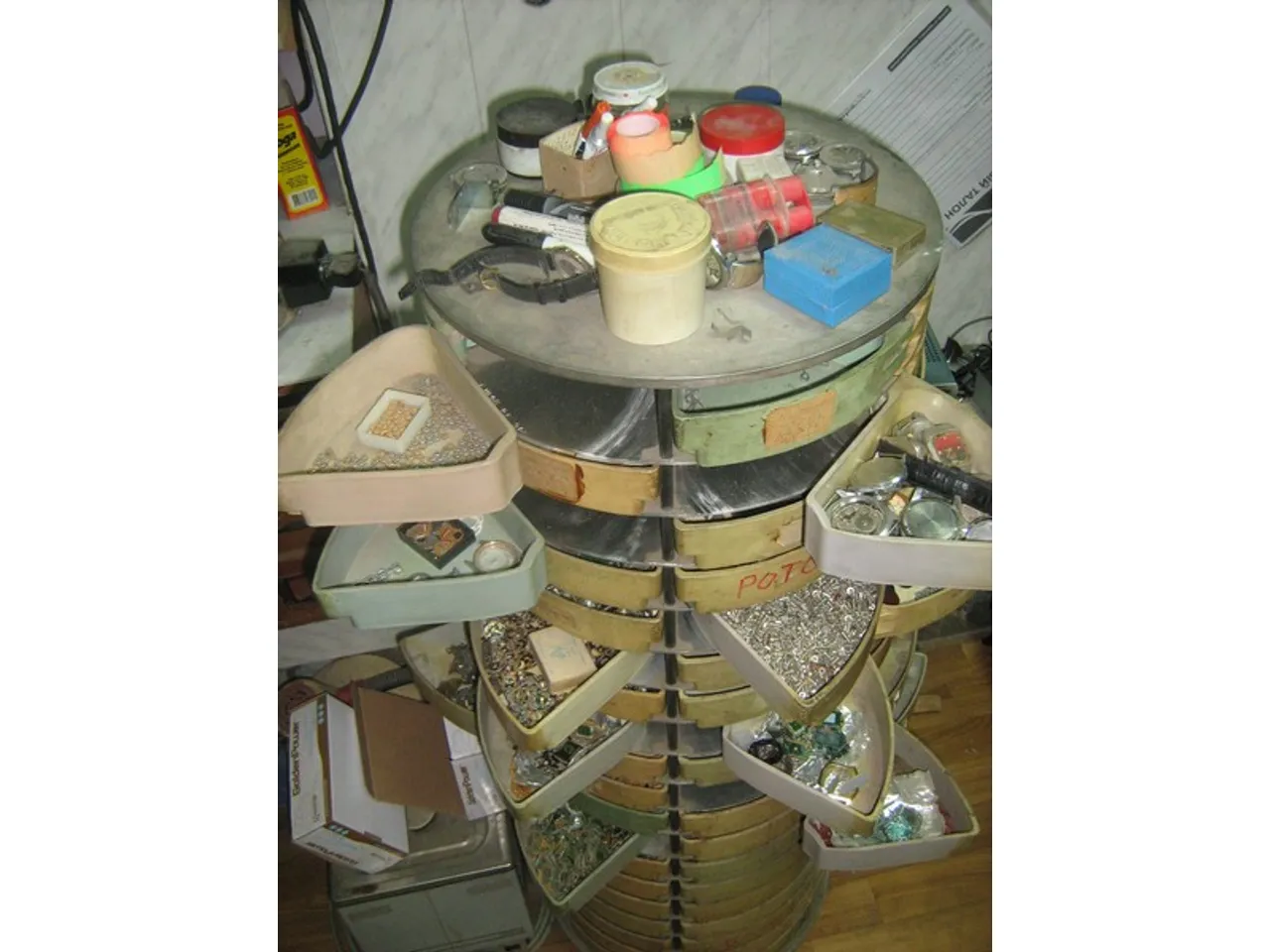 У самого Георгия Александровича в мастерской много-много маленьких ящичков с запчастями для часов — колесиками, винтиками, узлами и чем-то ещё, очень нужным для ремонта часов.