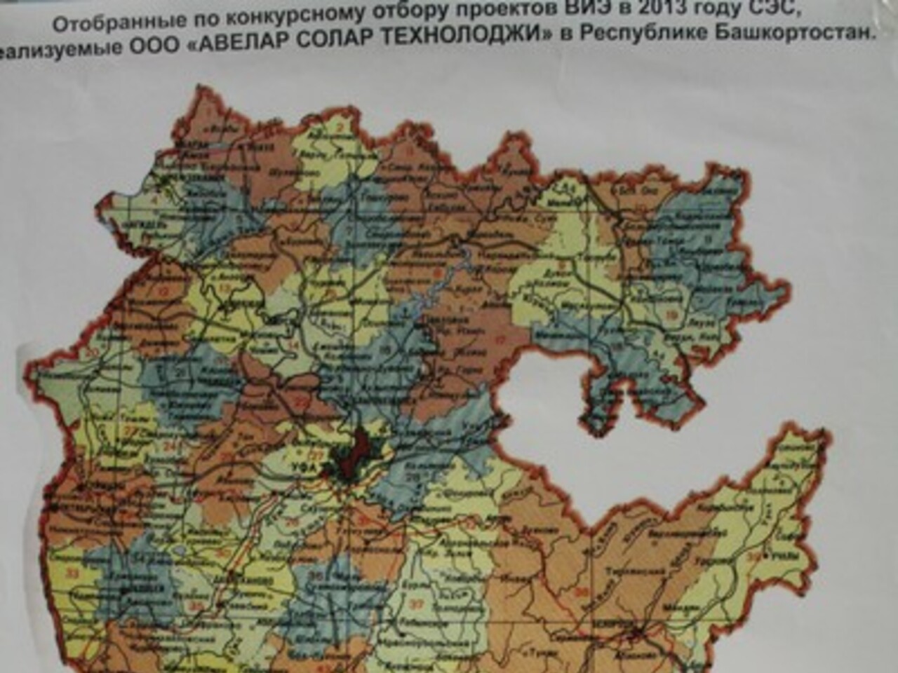 Также министерством совместно с компанией «Авелар Солар Технолоджи» были определены на юге Башкирии ещё четыре площадки под строительство СЭС общей мощностью 39 МВт. Ввод в эксплуатацию этих объектов планируется завершить к 2016 году.