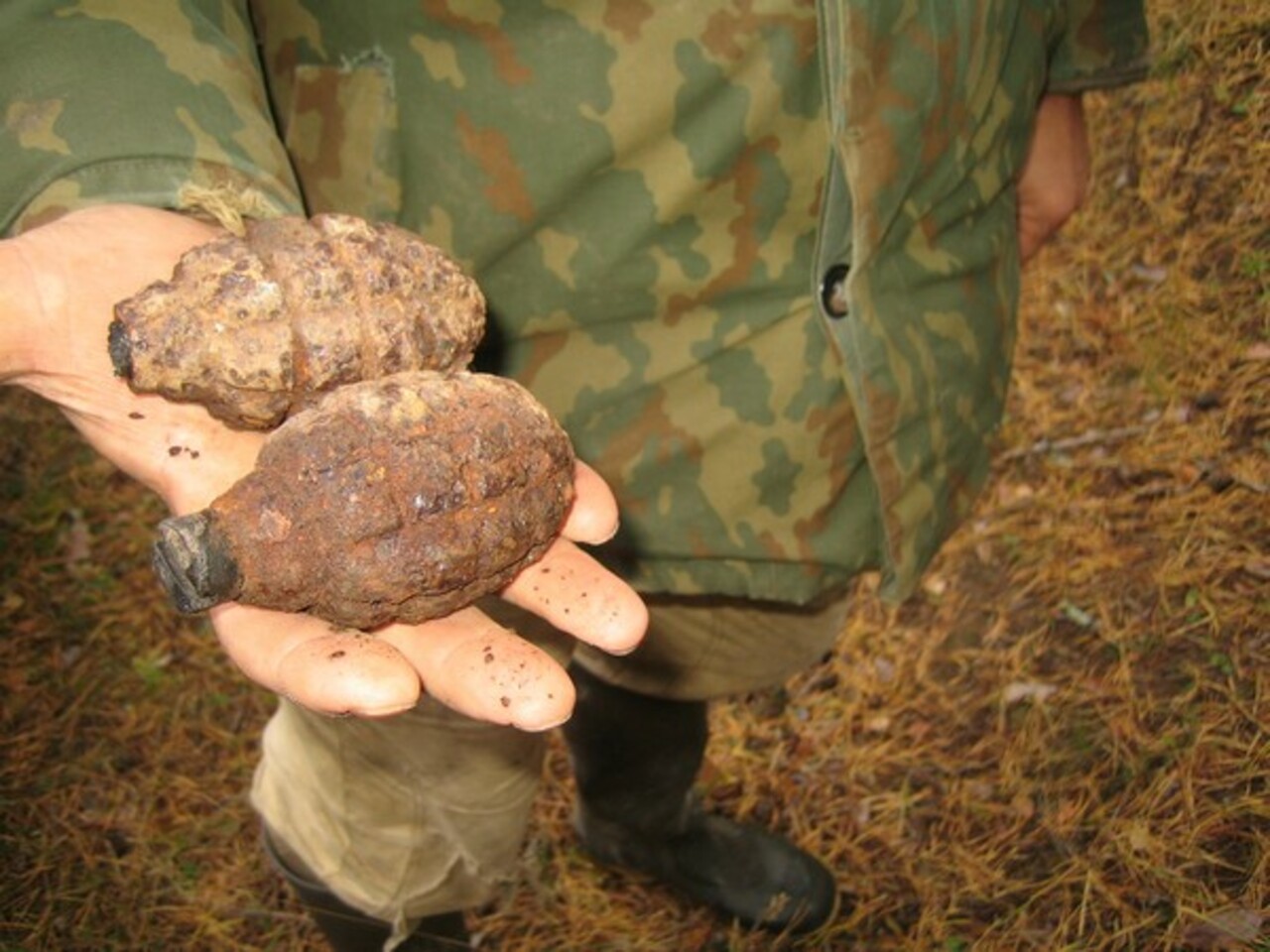 А в лагере уже новые люди: прибывшие саперы деловито фиксируют опасные находки поисковиков: авиабомбу, мину противопехотную, гранаты, снаряды и аккуратно забирают их. Рассказывают, только что подбежала бабуля: «Помогите, копаю в огороде, а лопата в гранату ударила, там ещё 13 штук!»