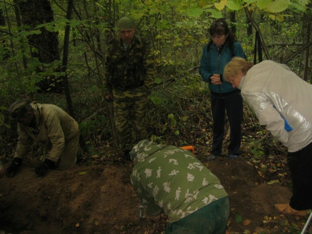 Не прошло и получаса, слышим какие-то крики из глубины леса. Лариса ведет нас в ту сторону: «Не иначе, как ребята снова бойца нашли». Да, так и есть. Зилия и Соня простояли на краю ямы, не отрываясь, несколько часов. Они увидели своими глазами, как возвращают солдата из небытия.
