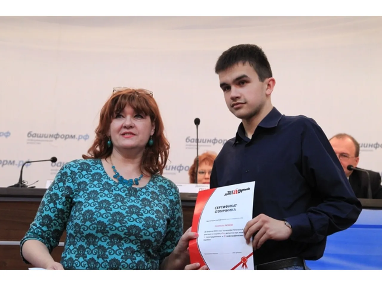 Отличников «Тотального диктанта» наградили в Уфе. Торжественная церемония состоялась 28 апреля в информационном агентстве «Башинформ». Одновременно были озвучены результаты конкурса журналистских работ на тему «Мой Тотальный диктант», а партнеры и организаторы образовательного проекта получили благодарственные письма.