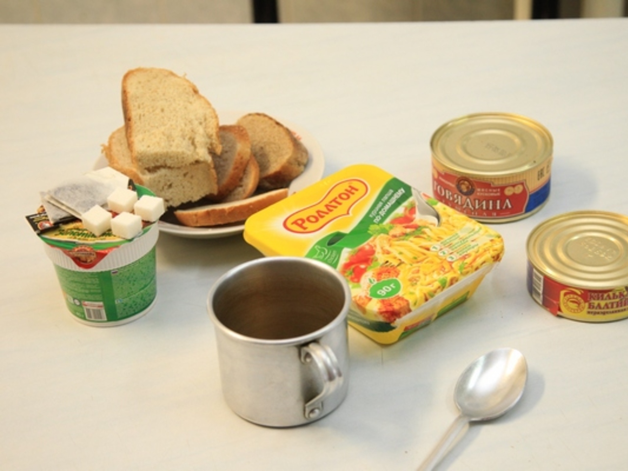 Также нам продемонстрировали продуктовый набор, который ежедневно получают постояльцы. В него входит упаковка картофеля и лапши быстрого приготовления, по банке мясных и рыбных консервов, пакетики чая и неограниченное количество хлеба.