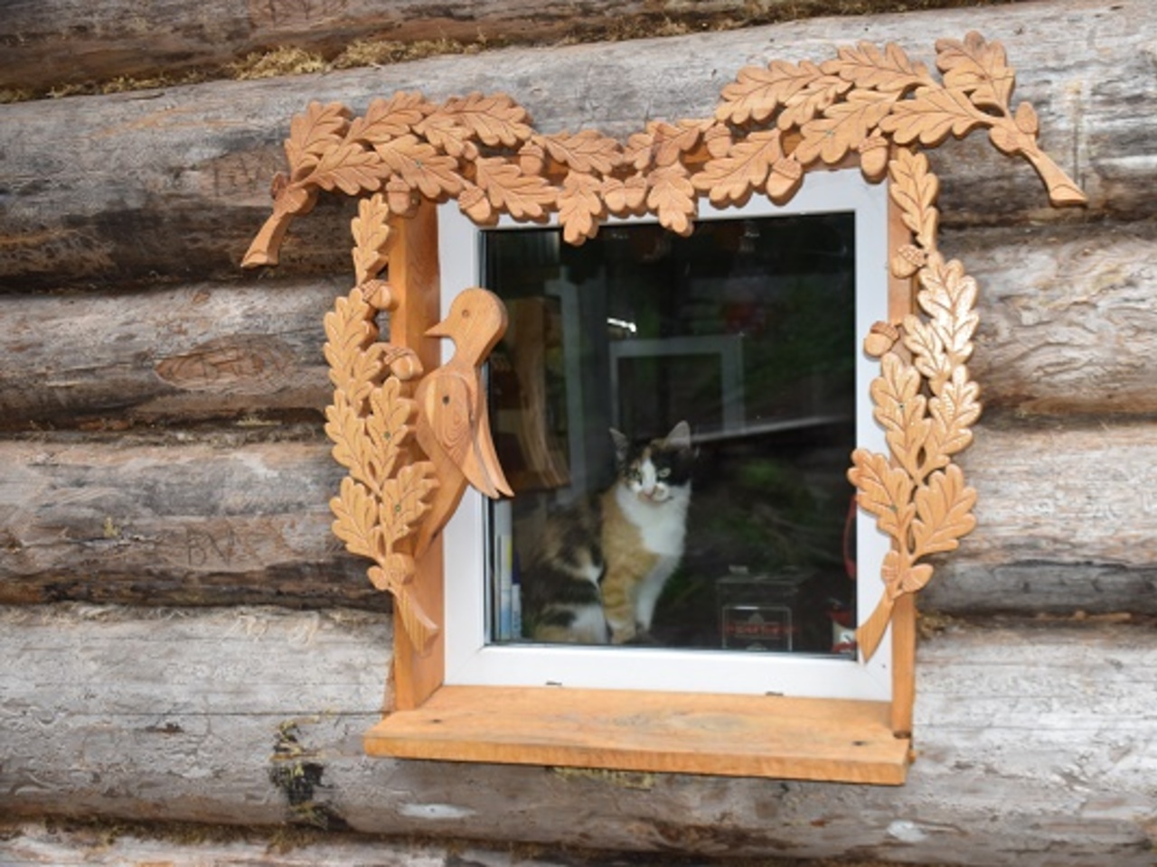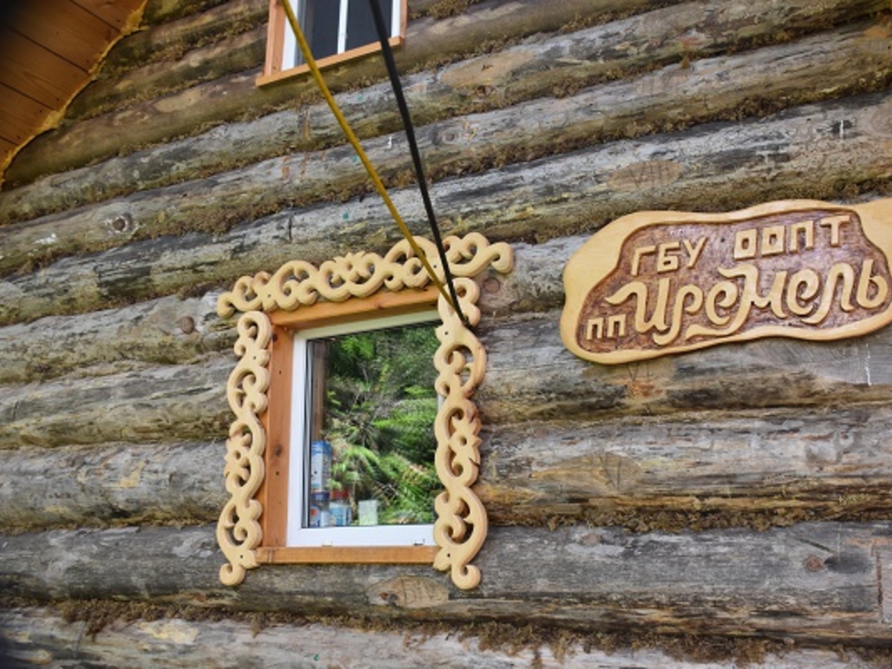 Домик на посту Тюлюкской инспекции ГБУ ООПТ «Природный парк «Иремель» украшен резными наличниками, фигурками зверей и птиц, надписями, вырезанными из дерева.
