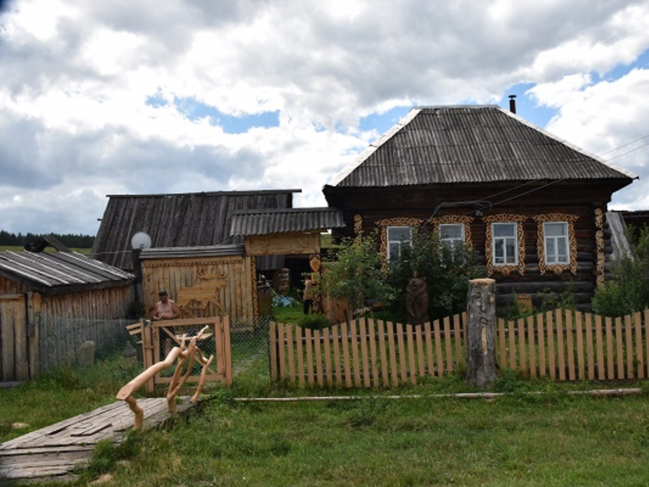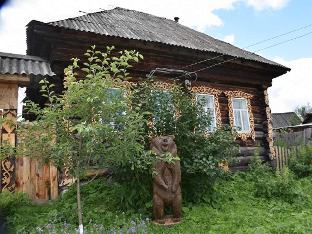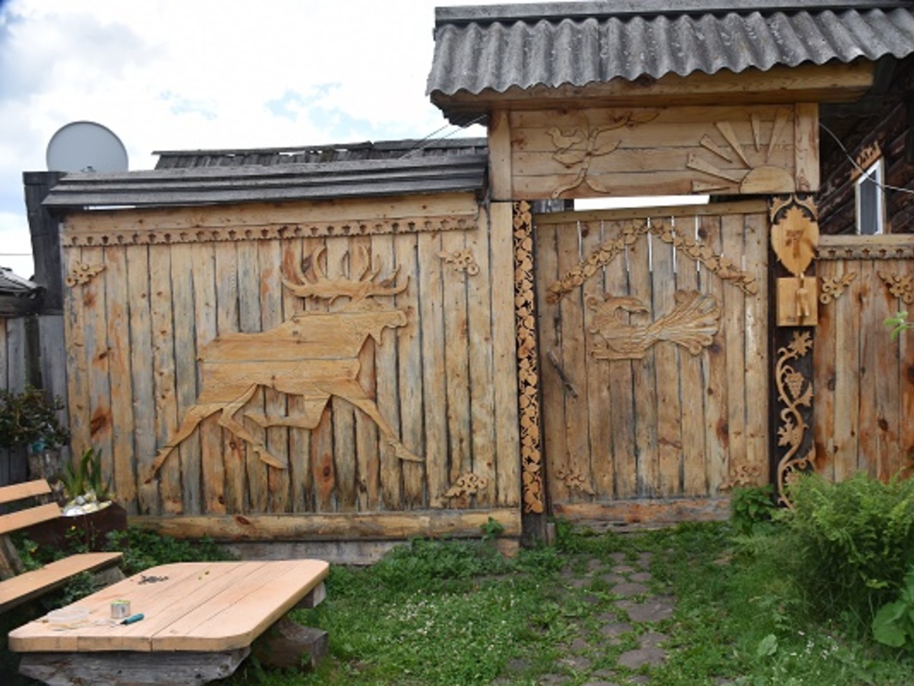 На воротах — мощный лось, в палисаднике — вырезанный из дерева медведь, мостик через канавку перед воротами огорожен причудливо изогнутыми перилами.
