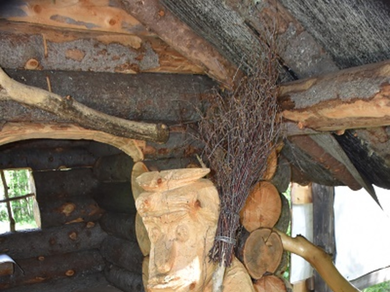 Художественно сложенные дрова. Лесовички, охраняющие покой туристов. Перила, вырезанные из затейливо изогнутых веток и любовно отшлифованные.