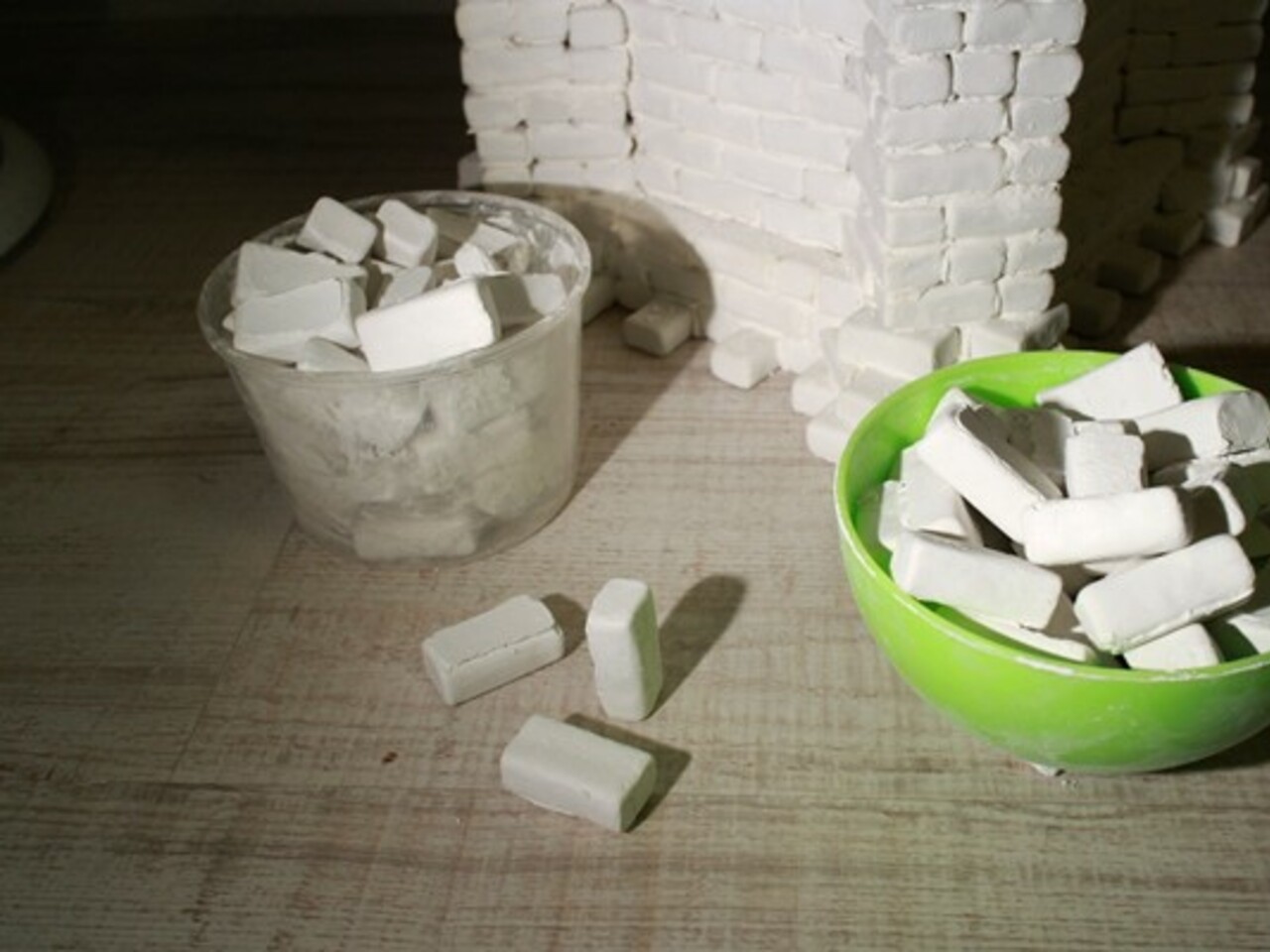 Из них на шпаклевку собираются различные сооружения. Получается довольно-таки прочно. Проект интересен тем, что постройки очень реалистичны, с крышами, с дверями, с окнами. А самое главное — при строительстве приходится продумывать, как в реальности, — где сделать несущие стены, где — просто перегородки, приходится делать правильную кладку, как в настоящих домах.
