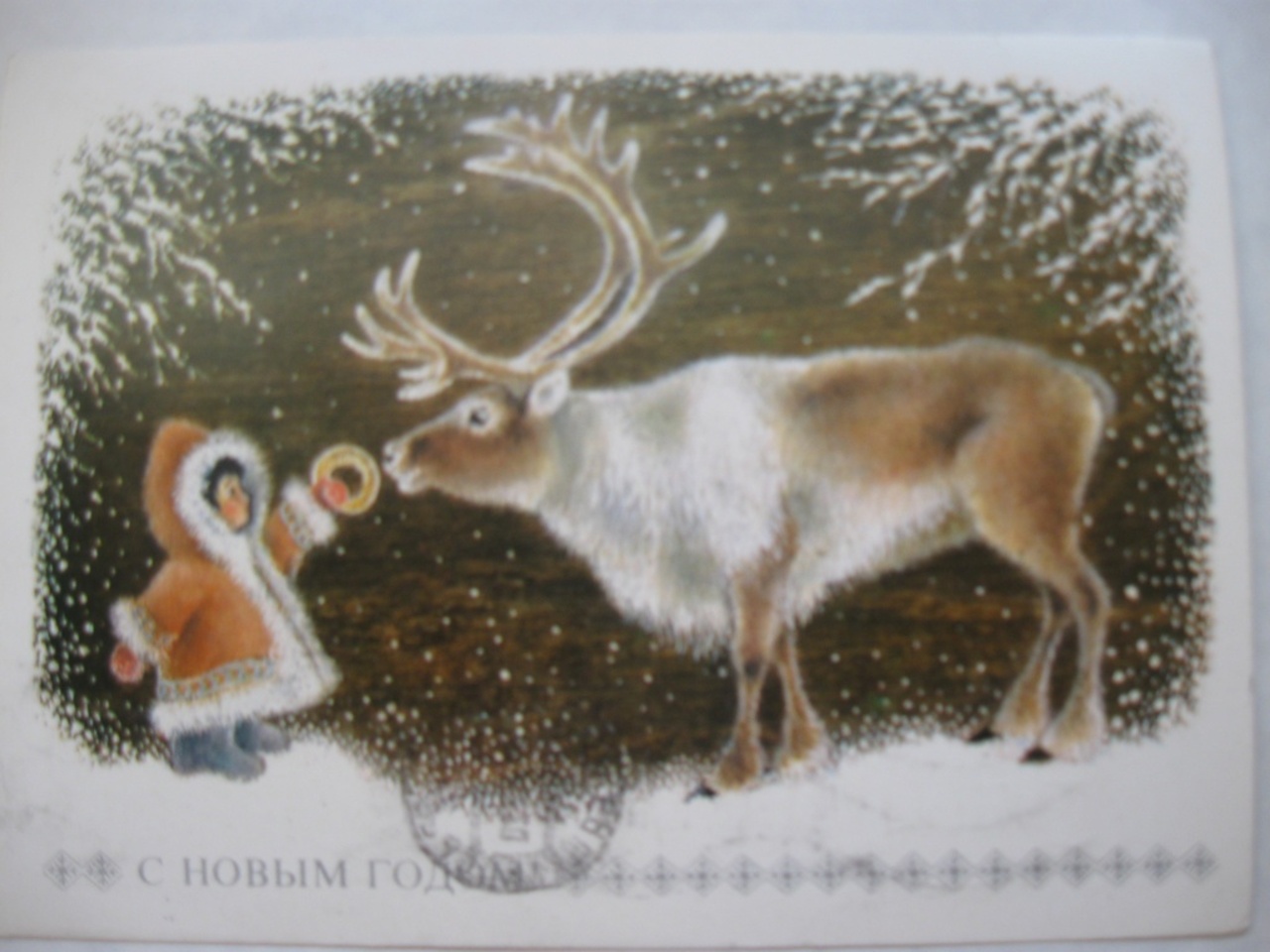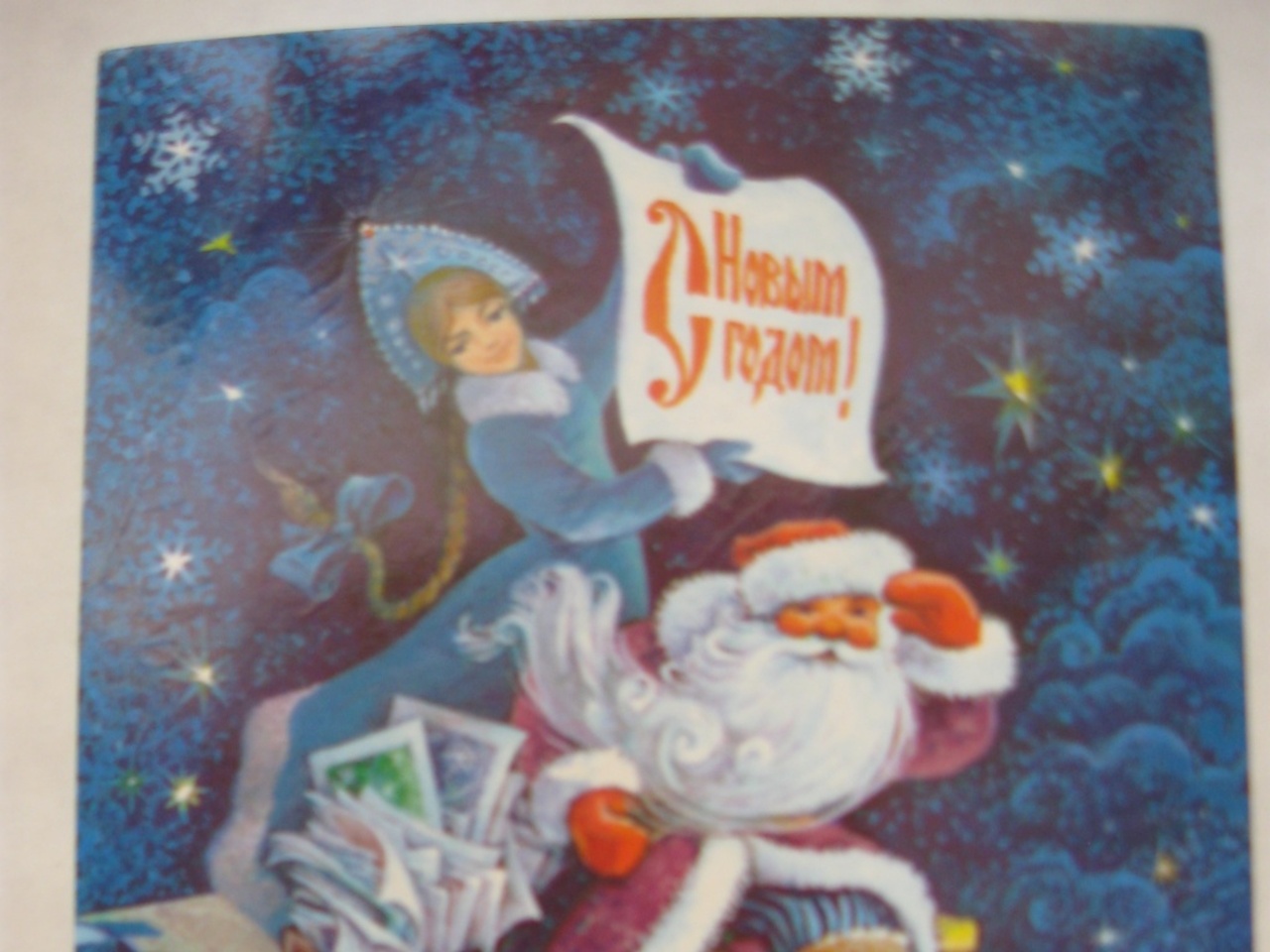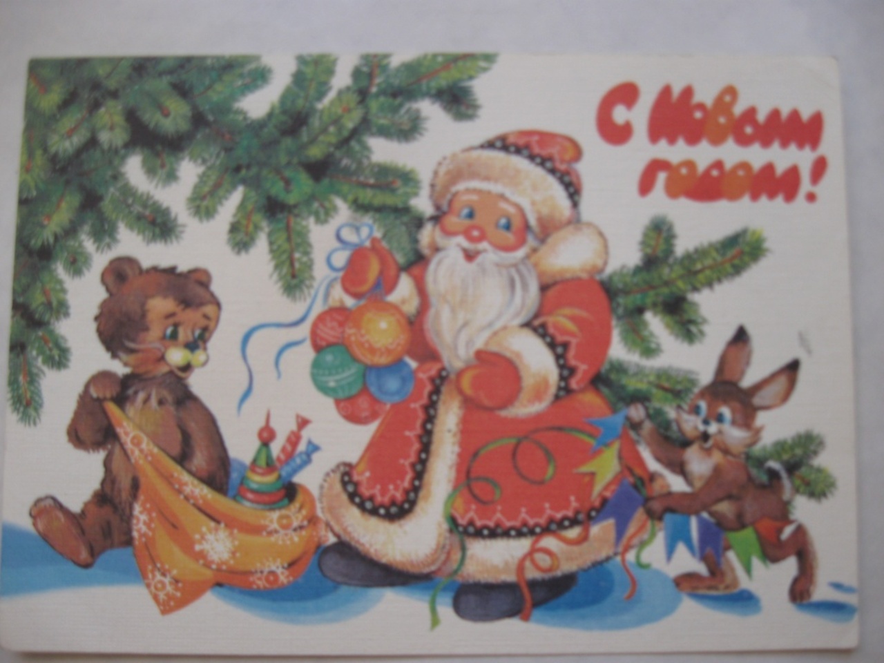 А вот открытка из сказочной серии с неизменными Дедом Морозом, Мишкой и Зайчиком. Выпуск 1989 года.