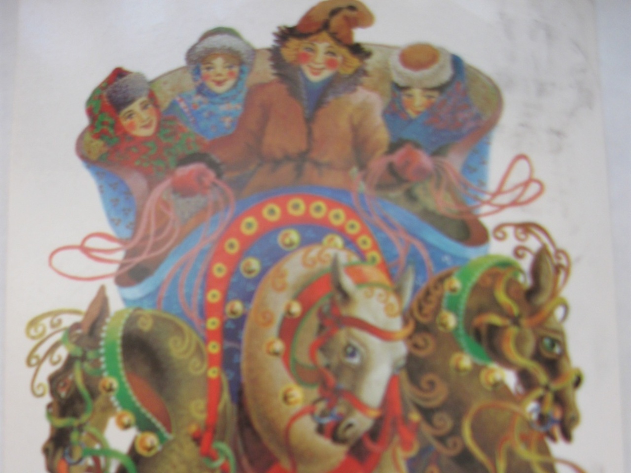 И, наконец, открытка, которая примчалась к нам из 1984 года. Тема русской тройки была популярна не только в изобразительном искусстве, но и в музыке, литературе, устном народном творчестве. Потому неудивительно увидеть на открытке молодого кучера с девицами-красавицами.