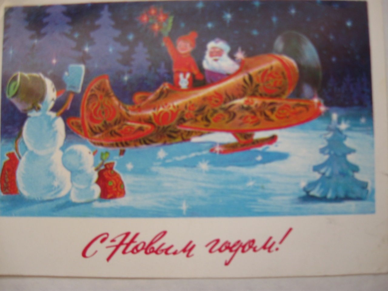 Игровые сюжеты, пожалуй, одни из популярнейших на новогодних открытках советской поры. На карточке 1979 года мы видим самолетик, раскрашенный в палехском стиле, который провожают Снеговики — также традиционные персонажи открыток и елочных игрушек тех времен и, конечно, любимцы детворы.