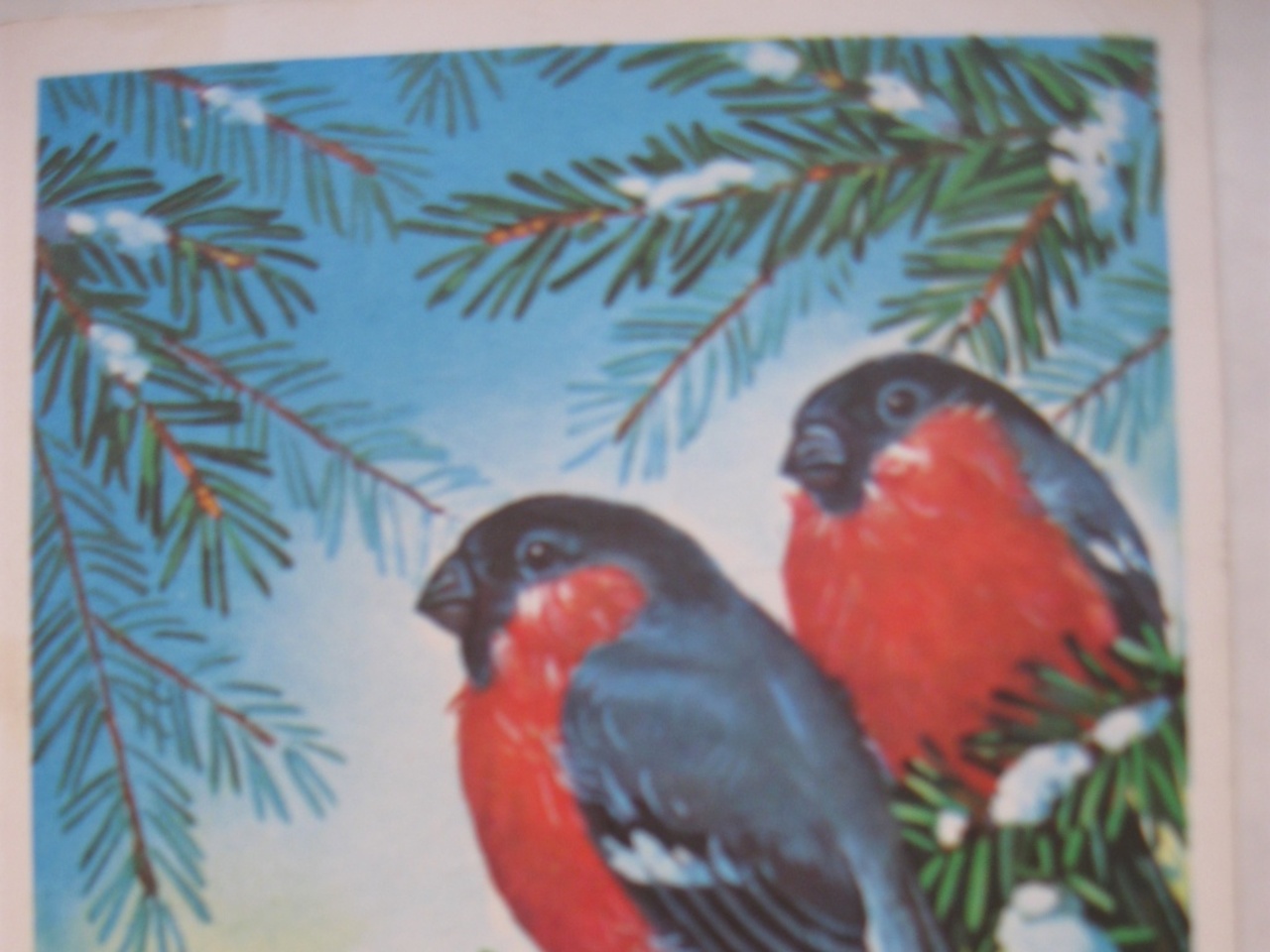 Снегири — это зимние птицы, навещающие нас с наступлением холодов. Потому красногрудые птахи нередко изображаются на новогодних и рождественских открытках. Эта выпущена в 1977 году.