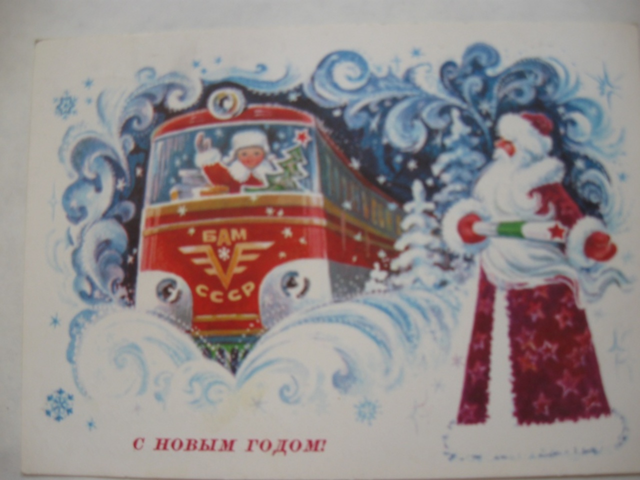 Вот, например, поздравление с наступающим 1978 годом. На открытке сказочный поезд со словами БАМ и СССР. Регулировщик — Дедушка Мороз, а в кабине машиниста — его внучек с ёлкой. Путь в счастливое будущее открыт! Только где теперь это будущее и казавшийся нерушимым Советский Союз?