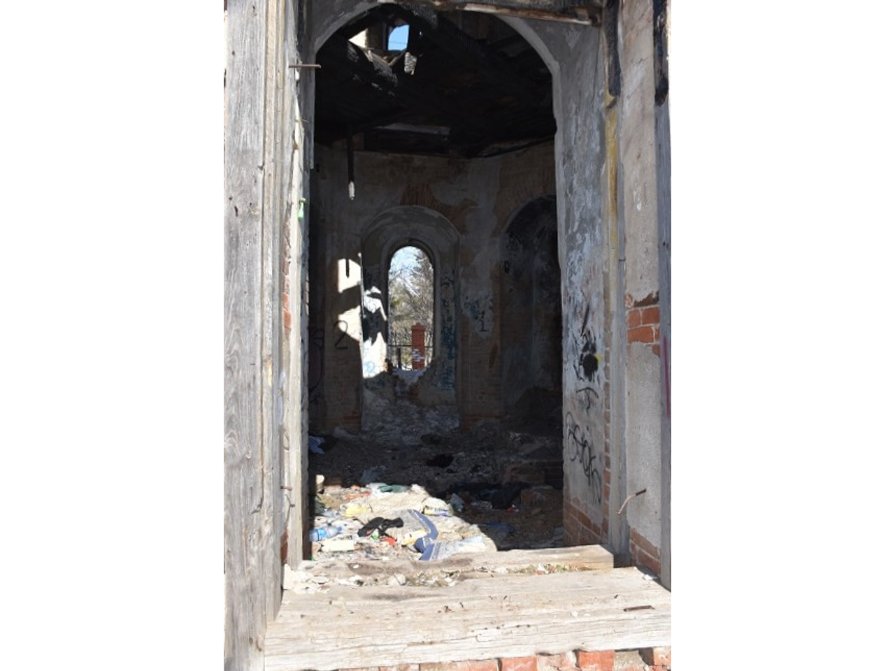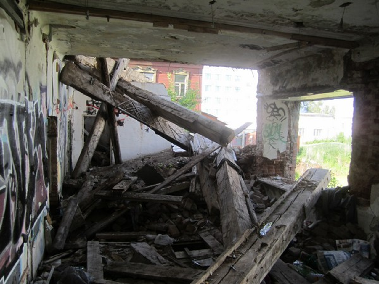 Однако спустя год ничего не поменялось. Здание так и стоит, огражденное забором, никаких работ внутри не проводится.