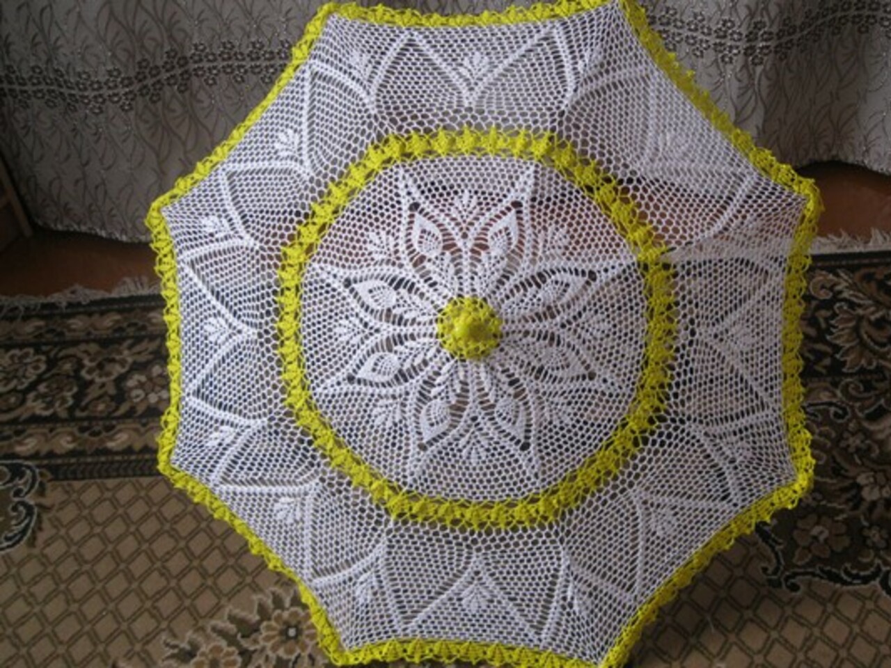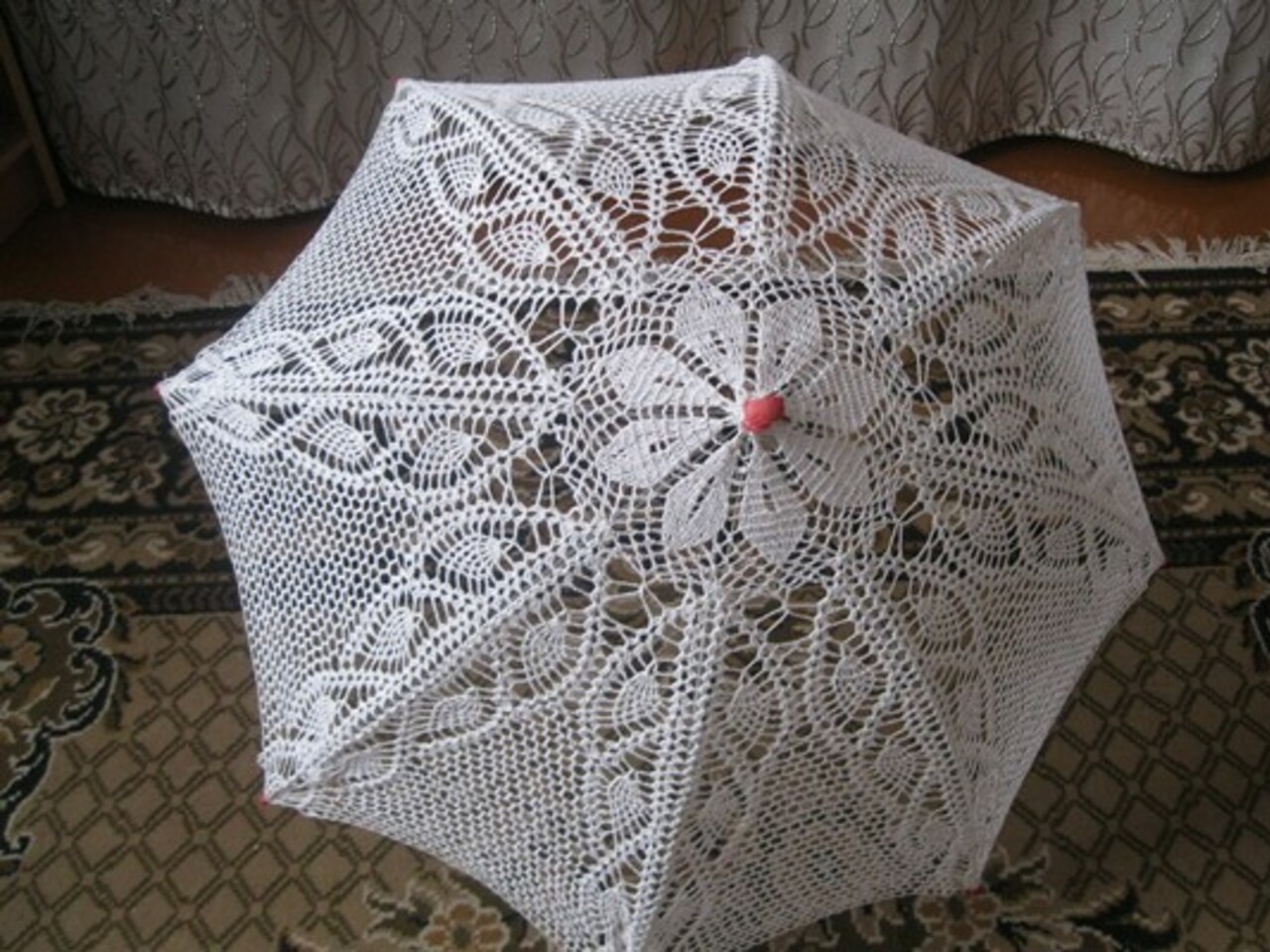 — Как-то раз мне попалась вырезка из журнала с вязаным зонтиком. Решила попробовать — получилось. На сегодня я связала уже пять зонтов — два детских и три взрослых. На один зонт уходит примерно три мотка хлопчатобумажных ниток.