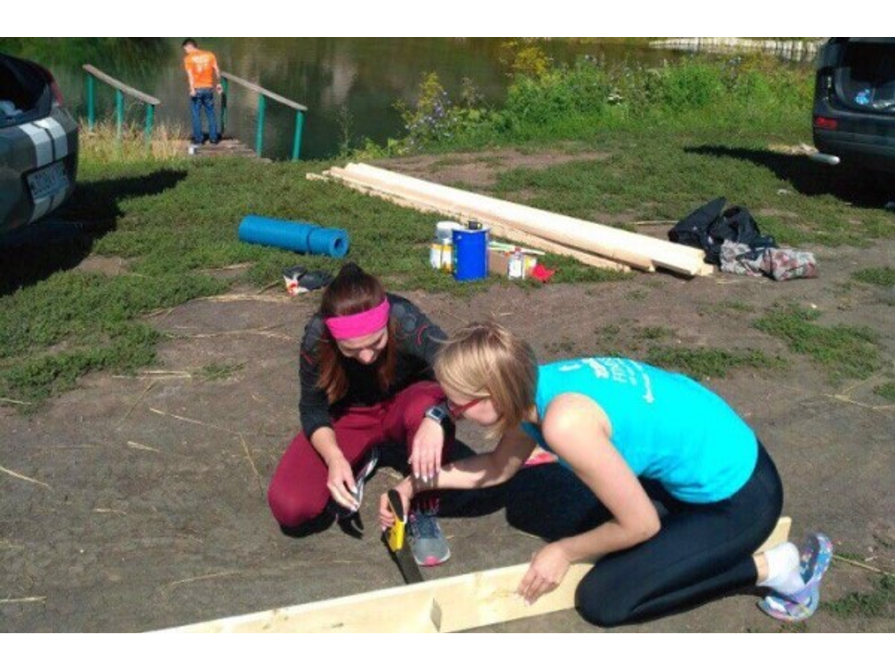 В понедельник утром мы заехали в магазин, купили доски, гвозди и краску и отправились к Голубому озеру. Парни занимались ремонтом моста, а мы с Таисией делали скамейки. Я впервые в жизни держала в руках пилу, зато теперь пилить научилась. Скамейку до этого тоже никогда не делала, и вообще с деревом не работала. Мальчишки — молодцы, отлично справились с задачей и нам помогли.