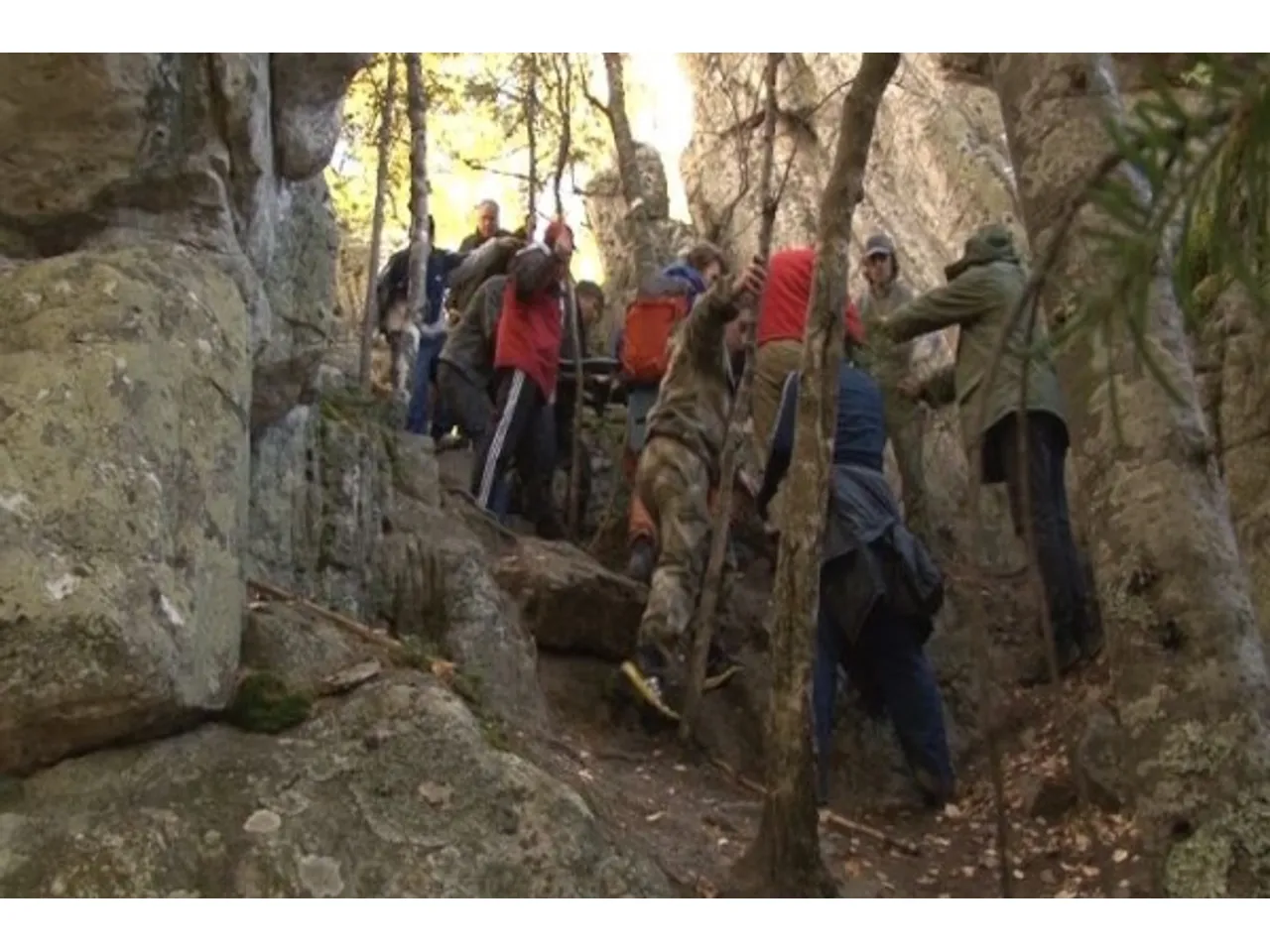 К нам подключились ребята-туристы, тоже ставшие свидетелями происшествия. Мы переложили пострадавшего парня на носилки и начали выбираться с поляны. А чтобы выбраться оттуда, нужно было преодолеть одну гряду зубчаток по тропкам, между камнями и деревьями, потом вторую гряду зубчаток в другом месте, и затем уже спускаться по склону. Приходилось одним проталкивать носилки в узкие проходы, другим принимать с противоположной стороны. Это был караван, очень медленно движущийся через горы. И при этом каждый очень четко выполнял те действия, которые он сам считал нужным выполнить, и те, что просили его сделать другие. Подменяли друг друга, помогали в движении, без всяких жалоб, спокойно, очень дружно, как будто слаженность нарабатывалась годами. Благодаря этой слаженности мы перевалили Зубчатки. В общей сложности шли с носилками до машины около четырех километров. Было тяжело. В связи с перепадами высот трудно было приспособиться, чтобы травмированный парень не сползал с носилок вниз головой. В конце концов стали ставить вперед высоких людей, а назад — пониже. Немного приспособились. Парень стал замерзать, и совершенно незнакомая туристка из Перми отдала ему безвозмездно свою куртку.