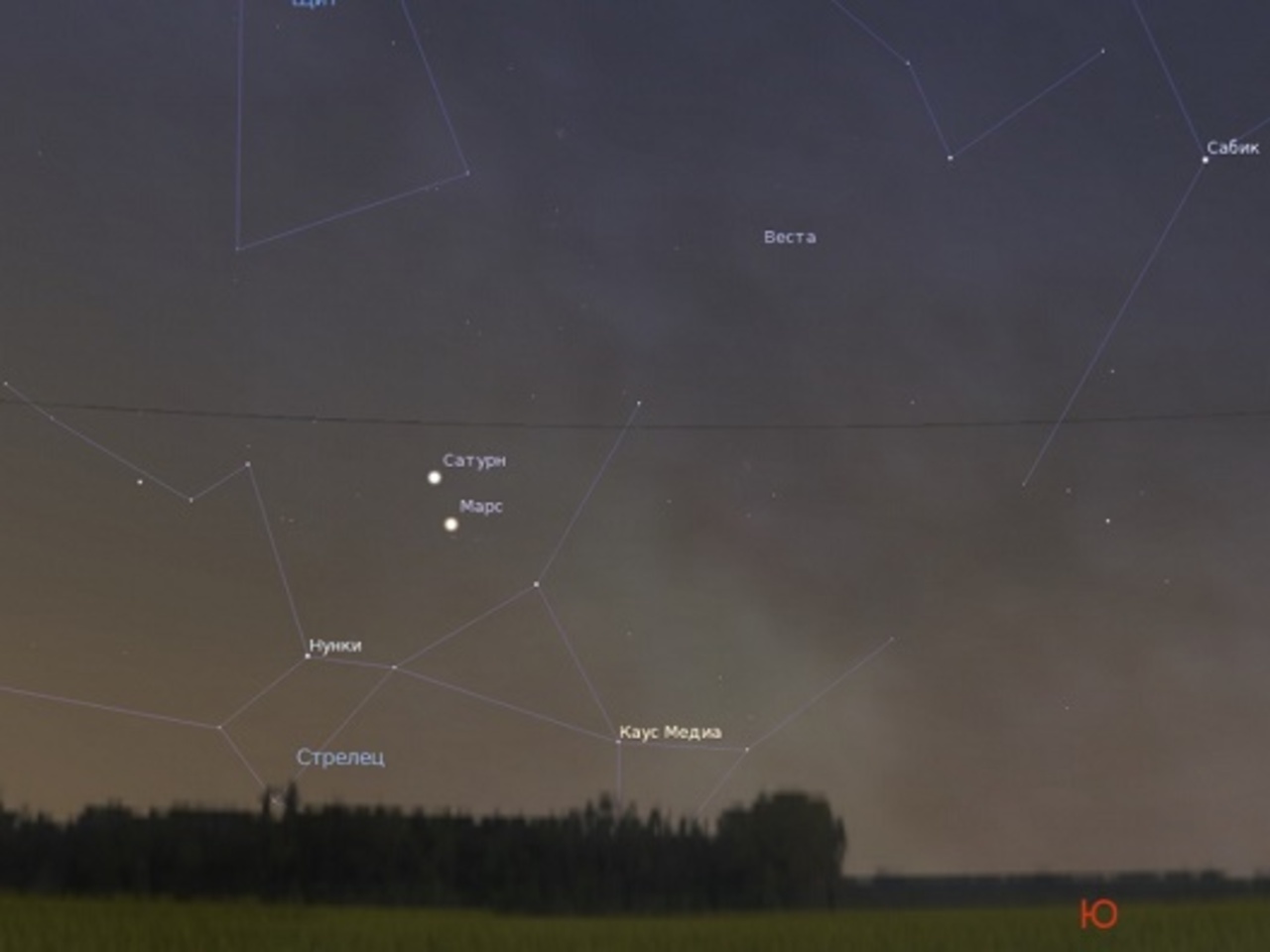 Планеты видны перед восходом Солнца невысоко над южным горизонтом в созвездии Стрельца. Они выделяются среди звезд своим ярким блеском. Восходят они под утро на юго-востоке: Сатурн в половине четвертого, Марс на десять минут позже.