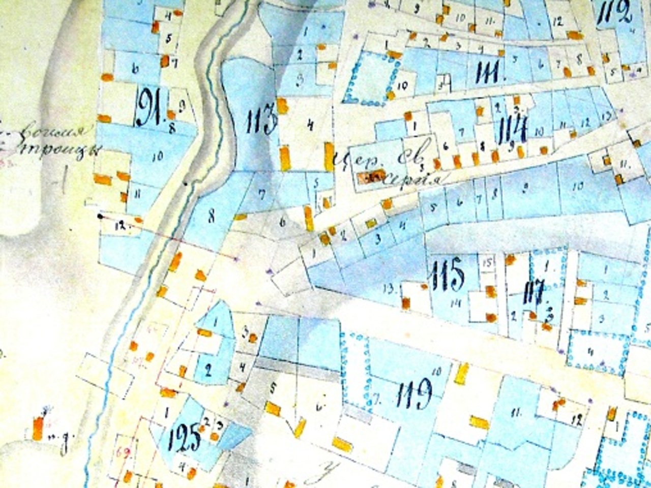 Так выглядит Сергиевская церковь и местность вокруг неё на карте Уфы 1852 года.