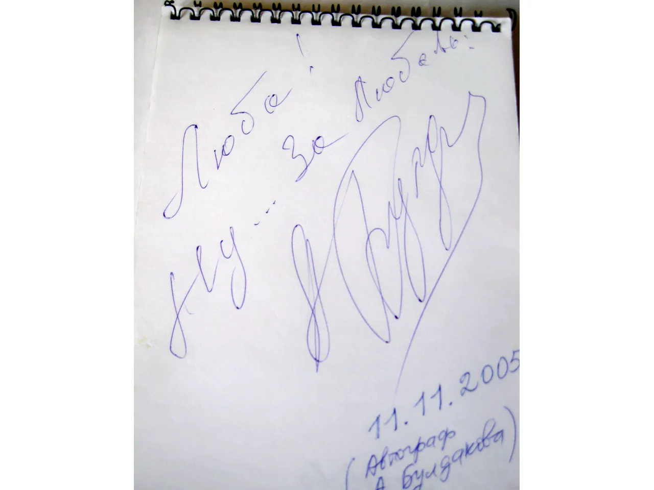 На память о встрече у меня в блокноте остался автограф Булдакова: «Люба! Ну... за Любовь!». Коротко и ёмко.