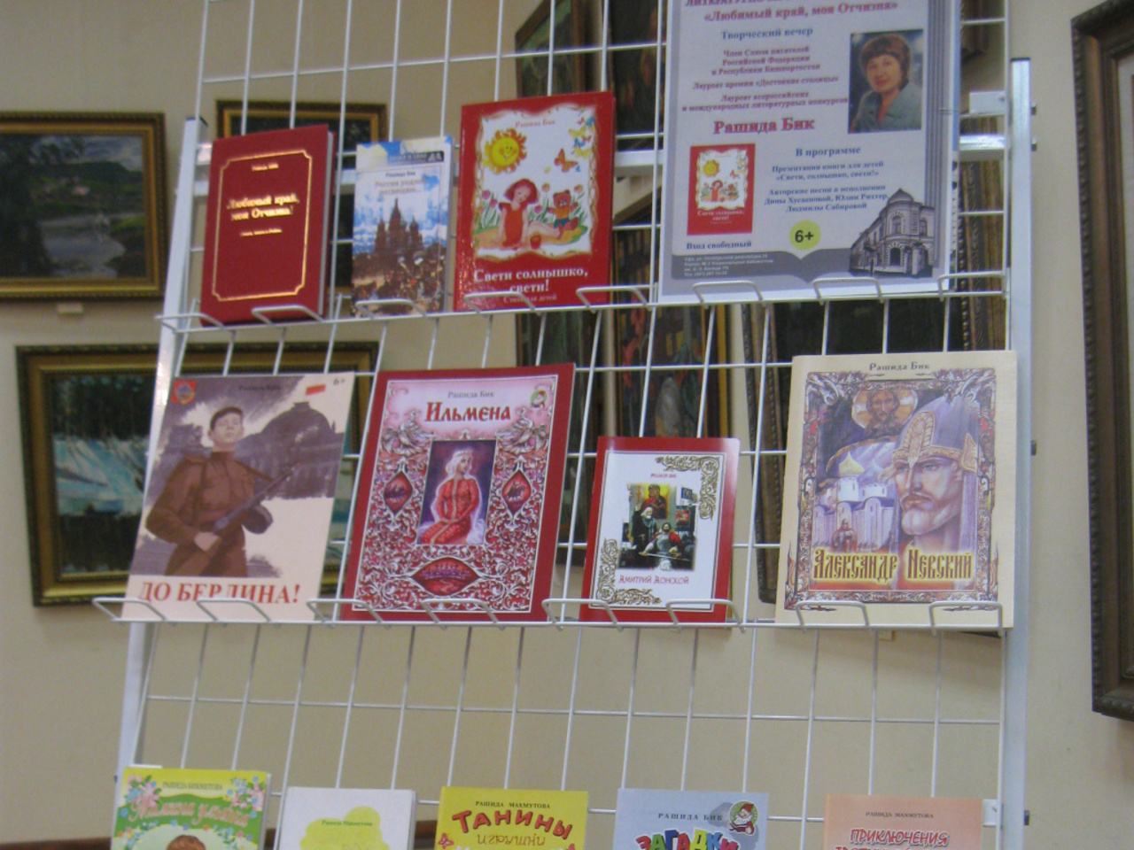 Еще хочу добавить, что Рашида Бик часто выступает в библиотеках перед школьниками и воспитанниками детских садов. Ее стихи с удовольствием разучивают дети, а педагоги и работники библиотек называют ее «второй Барто». Яркие, красочные, пронизанные добротой и любовью книги, выпушенные Рашидой, занимают уже целый стенд.