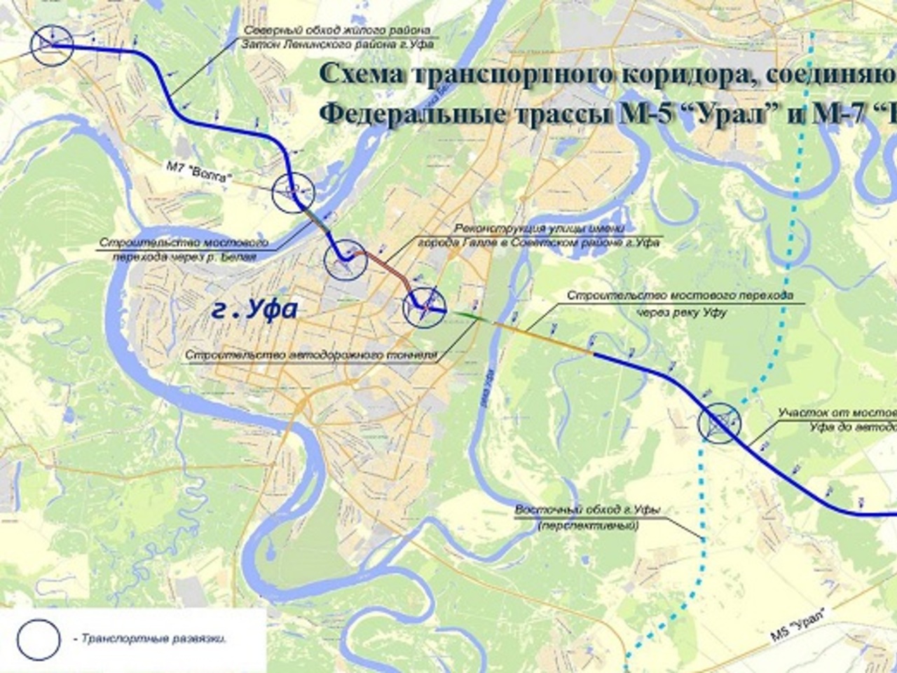 Частично этот проект уже реализован — построены магистраль Северный обход микрорайона Затон, новый Затонский мост. Основную проблему представляет вторая половина пути, так называемый Восточный выезд, от недостроенной развязки на проспекте Салавата Юлаева до трассы М-5. Соединить проспект и федеральную трассу мешают река Уфа и Восточный склон Уфимского полуострова с большим перепадом высот. Для решения проблемы планировщики решили пробить в склоне 1,2-километровый тоннель, что делает возможным создание моста через реку Уфу, который, в свою очередь, должен стать началом дороги до трассы М-5. Реально в 1994 году начал строиться только тоннель. Работы шли десять лет, и в 2004 году были приостановлены.
