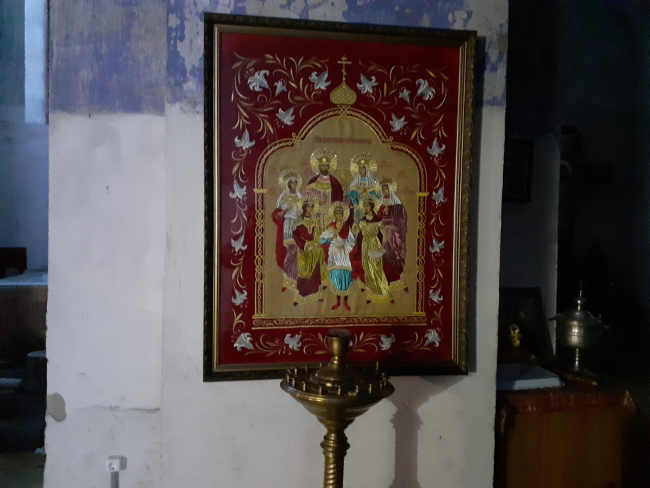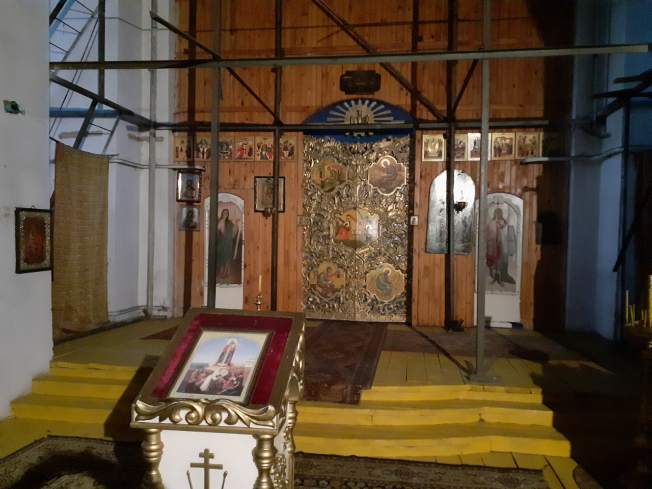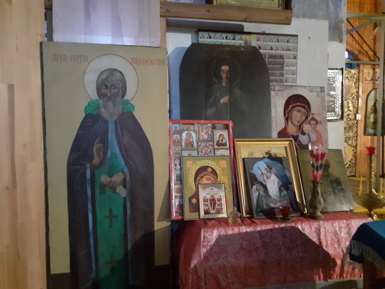 История сурово обошлась и с иконами храма. Об одной из них — иконе Дмитрия Солунского — рассказал отец Андрей. Святыня досталась одной женщине после смерти ее бабушки. Икона служила дверкой в сарай, была совсем черной. По утверждению паломников, во время службы она посветлела. До сих пор на лике святого заметны следы вандализма, похожие на удары ножом или топором.