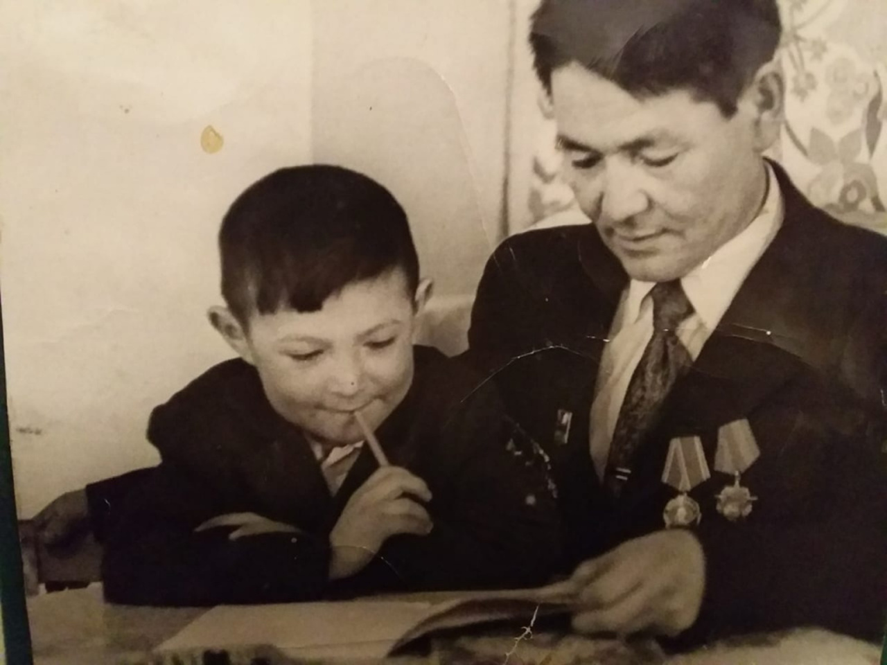 На этом фото — отец и сын. Риза Хажиахметович и Рашит. Когда сын сел, как помощник, на тот же комбайн, им не стало равных: В самое трудное время Рашит работал днем, отец — ночью. Комбайн работал круглосуточно, если не считать утренних полутора часов на техпроверку.