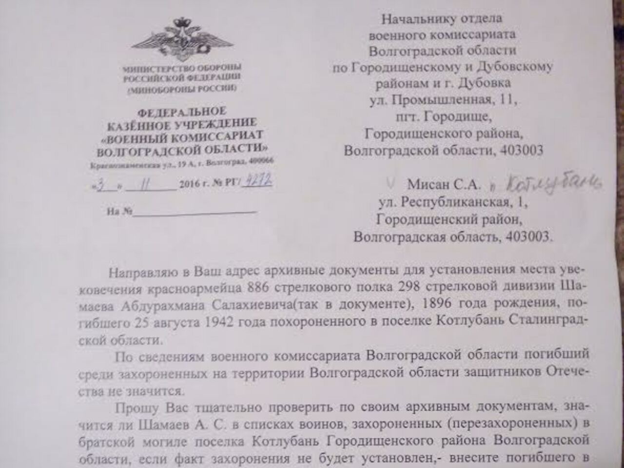С.М. «Получен ответ из облвоенкомата и райвоенкомата. Фамилию А.С.Шамаева внесли в список захороненных в братской могиле п. Котлубань Городищенского района Волгоградской области. Я просила военкомат рассмотреть дела бойцов, погибших вместе с Шамаевым, и вы видите, что все 22 человека увековечили в нашей братской могиле. Весной внесут имена на памятник. (Так что благодаря Шамаеву из Башкирии, имена погибших с ним красноармейцев тоже внесены на увековечение — авт.)