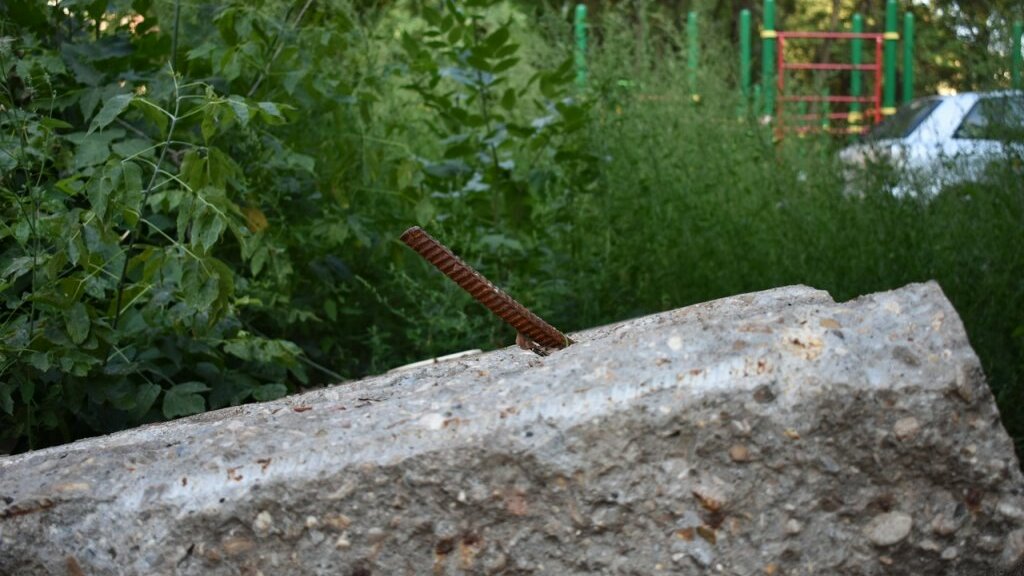 Уфимский двор представляет серьезную опасность для детей. Рядом с детской площадкой лежат бетонные блоки, из которых торчат ржавые штыри. Один ребенок уже пострадал.