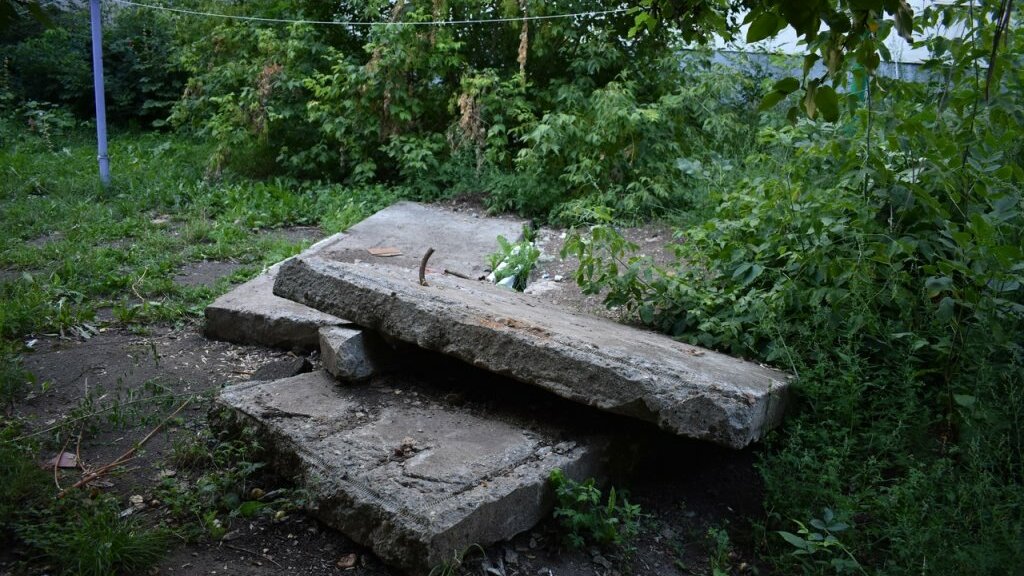 Хотя жильцы дома помнят, что несколько лет назад у них возле дома проводился ремонтные работы по замене труб, старые плиты достали и сложили во дворе, заменили их на новые, а старые вывезти так и не удосужились.