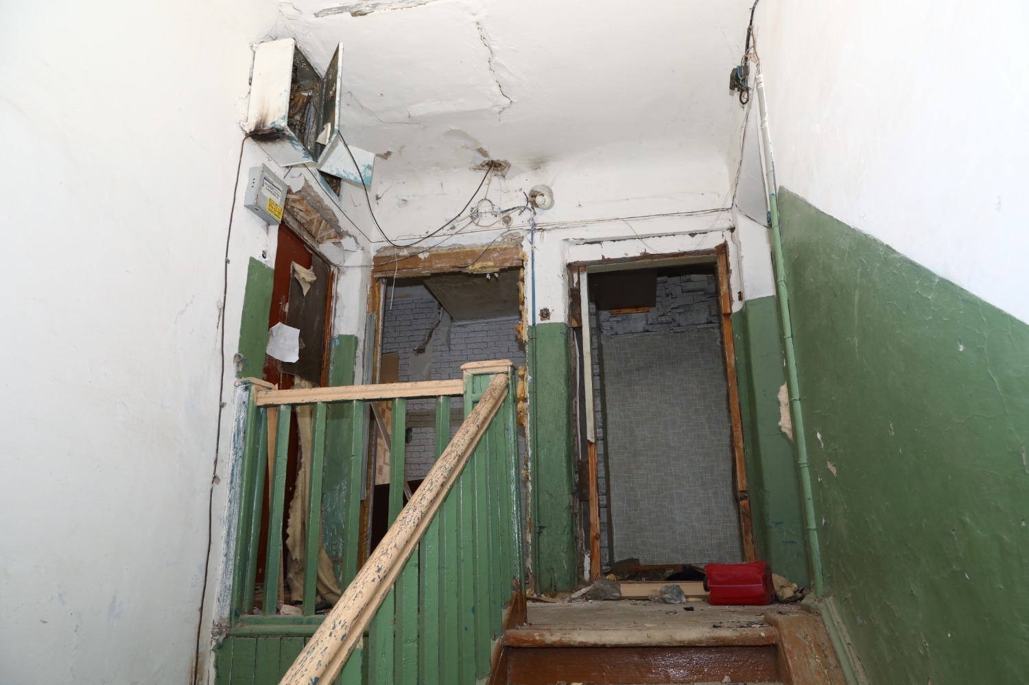 «Электрогазета» выехала на место. Проблемная двухэтажка встречает зияющими провалами окон. Стекла присутствуют только в нескольких жилых квартирах. Придомовая территория не ухожена и завалена самым разнообразным мусором. Очевидно, что уборка здесь не проводилась очень давно. Состояние подъездов также не радует — разруха, грязь, осыпавшиеся стены. В одном из подъездов отсутствует дверь.