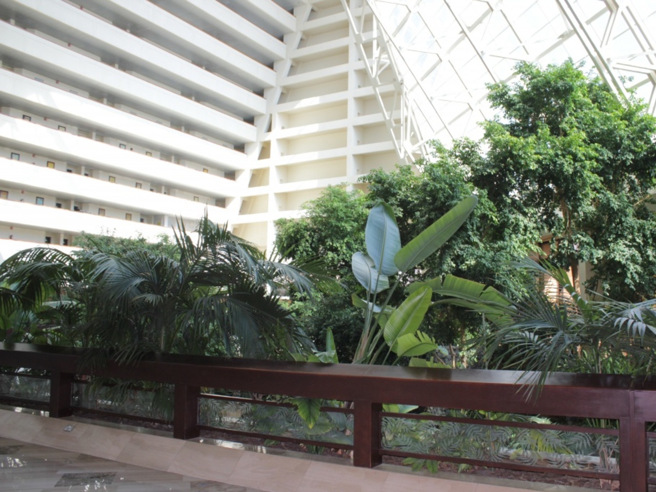 Приятно было находиться и в лобби отеля. Ведь там росли настоящие деревья, пели на разные голоса птицы и шумел водопад. Выходя из номера утром, первое, что слышишь – пение птиц и шум воды. Еще один удачный ход со стороны владельцев - конструкция крыши в виде прозрачных блоков. Благодаря этому в отеле много света и свободного пространства.