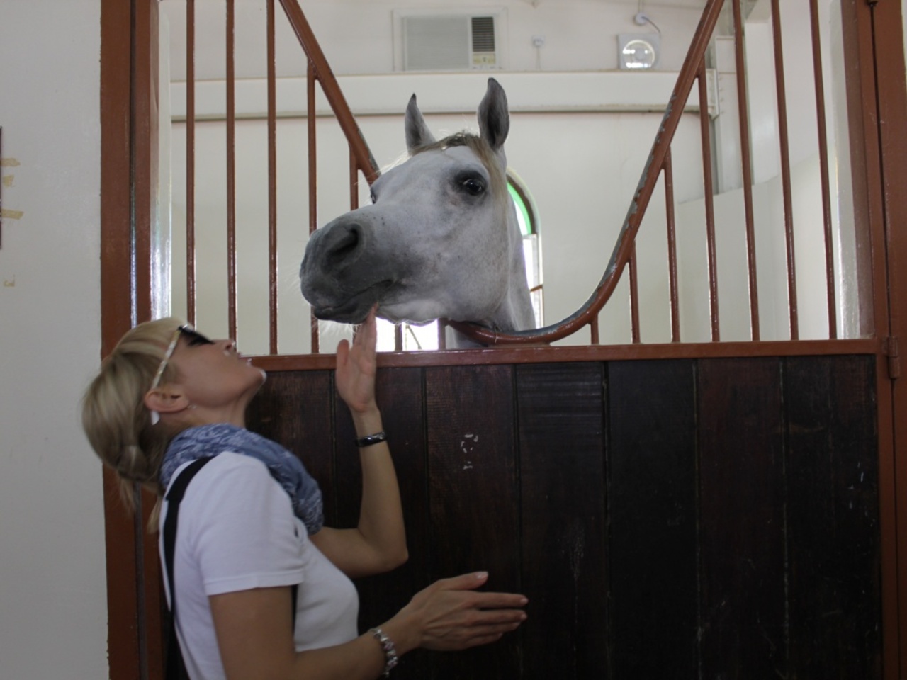 Как оказалось, арабская лошадь – спокойная и миролюбивая. Она чем-то похожа на женщину, которая отлично осведомлена о своей красоте. Выпуклые выразительные глаза, широкие ноздри, кокетливая челочка… Одним словом, чудо, а не животное! С большой охотой арабские лошадки тянулись к нам изящными мордами, ожидая, что их погладят. После чего стало понятно - у этих существ самый добродушный темперамент!