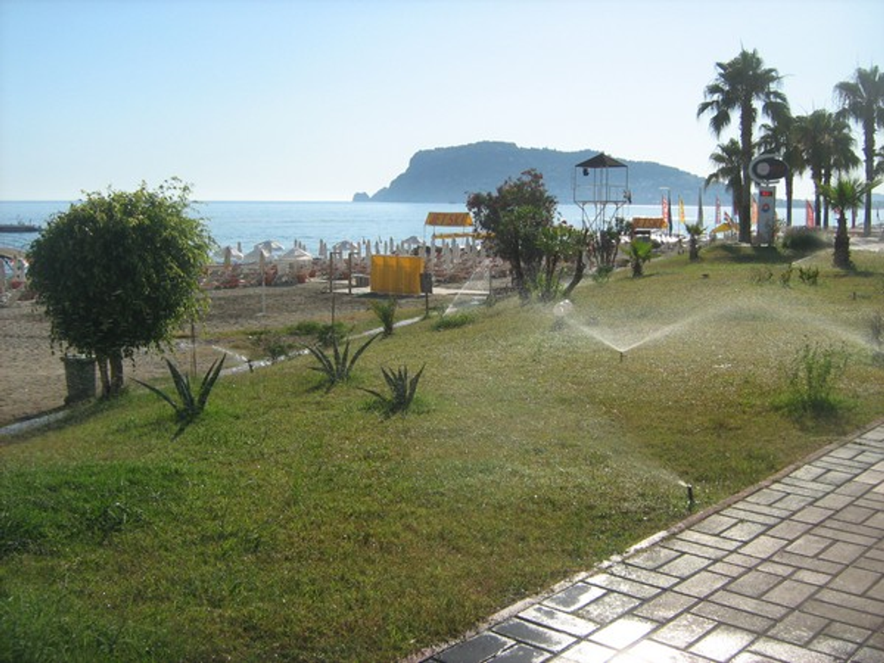 В Турции жарко. И растениям там приходится нелегко. Поэтому их поливают каждый день ближе к вечеру автоматическими поливалками.