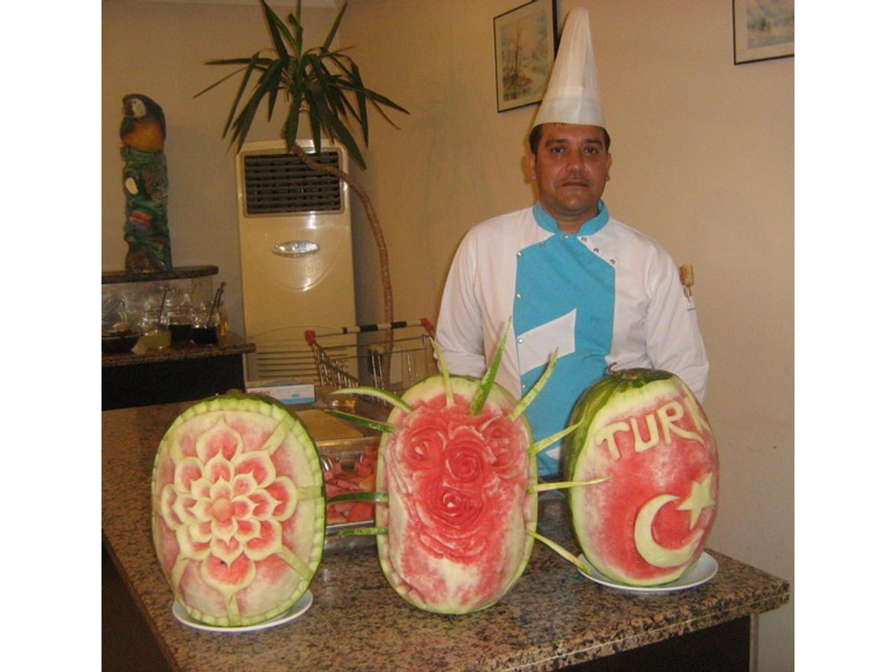 Ну и на сладкое еще об одном виде творчества, который радует людей в Турции. Это искусство очень разнопланово и применяется в отельных ресторанах. Например, художественная резьба по арбузам. Периодически в нашем отеле шеф-повар Халим создавал очередной шедевр в виде флага Турции, или роз, или абстрактного узора на арбузе.