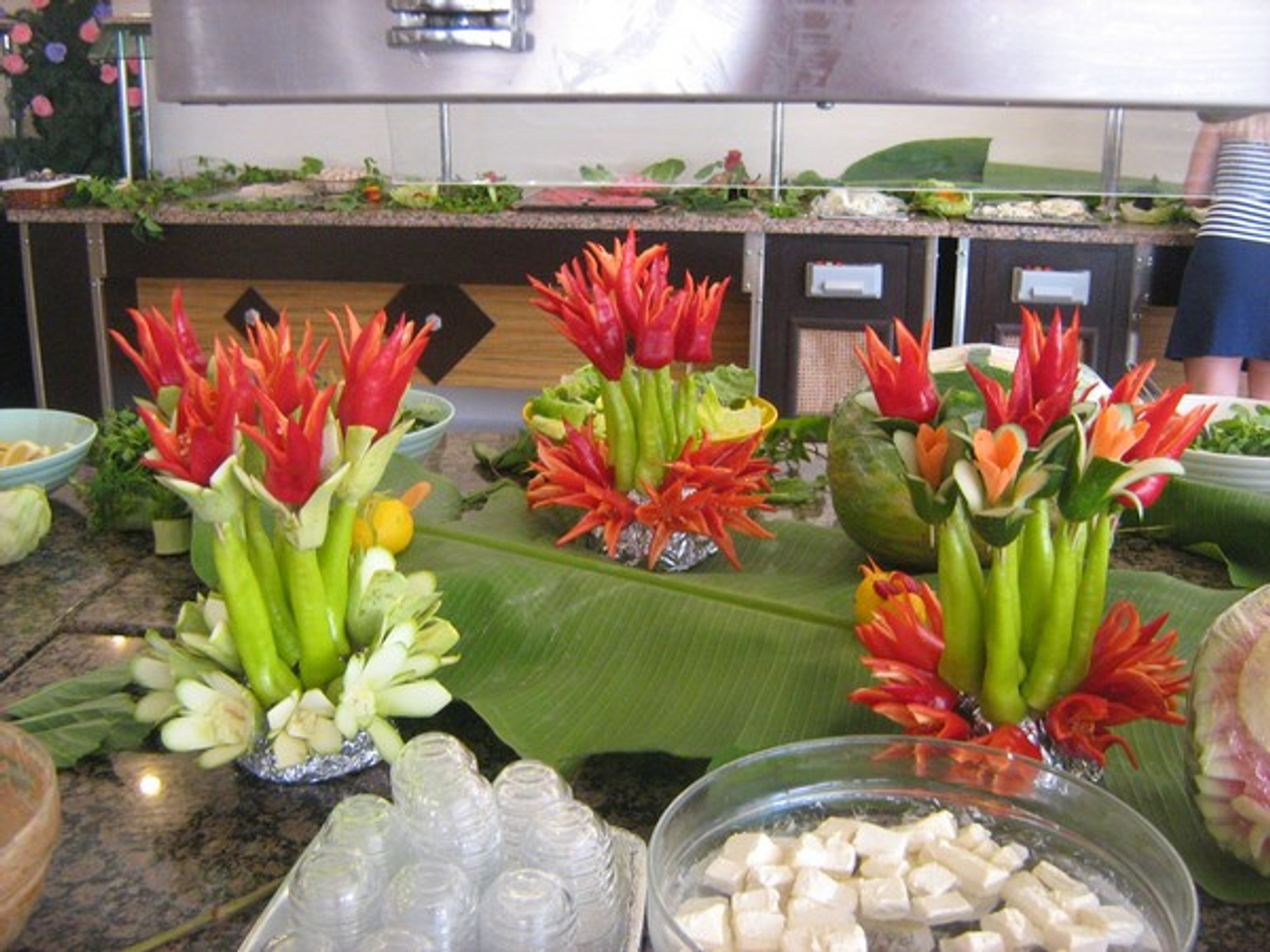 Или букеты цветов, сделанные из сладкого перца и еще каких-то овощей. Тоже смотрится очень эффектно. Поварам с художественной жилкой сделать это, очевидно, нетрудно, а хорошее настроение отдыхающим с утра обеспечено.
