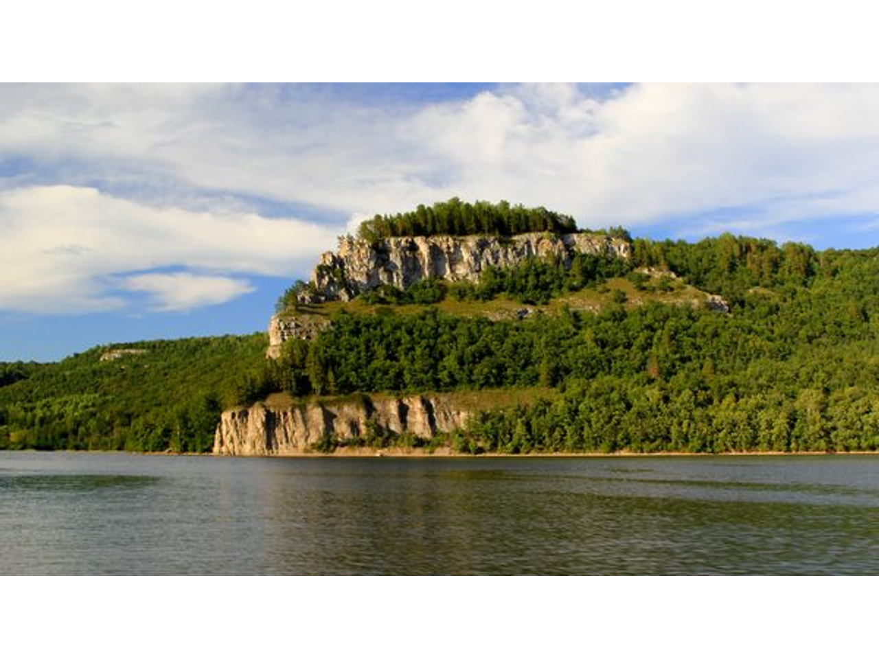 Безусловно, самой интересной частью Нугушского гидроузла является его верхняя часть, то место, где водохранилище сжато скалами и поросшими лесом древними известковыми горами. Здесь вам обязательно покажут два весьма живописных родника: Девичьи и Мужские слезы.
