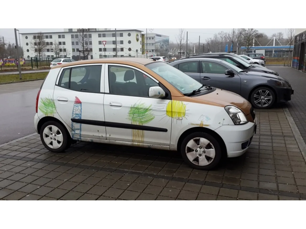 Однажды мы остановились на парковке, рядом с нашим автомобилем был припаркован небольшой автомобиль, разрисованный всеми цветами детского карандаша, будто его только что разрисовал малыш лет пяти.