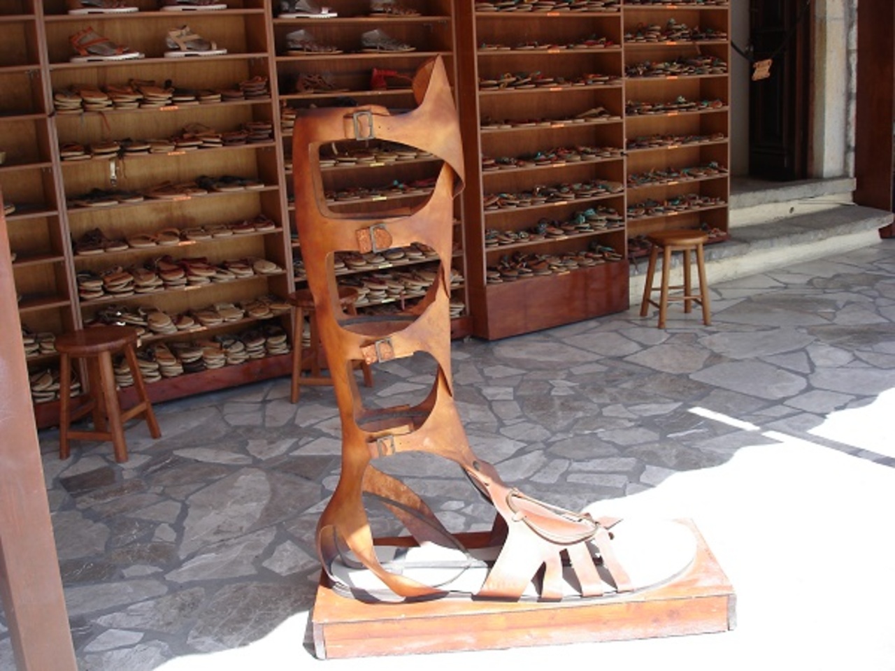 Местная знаменитость — обувных дел мастер Такис. Прогулявшись по набережной вправо, можно обнаружить крупный магазин кожгалантереи, принадлежащий этому сапожнику. Груды аутентичной греческой обуви на плоском ходу, сумки, кошельки, аксессуары… Пропустить магазинчик очень сложно — рядом с витриной установлена огромная плетеная сандалия из кожаных ремешков (с ней, безусловно, обязан сфотографироваться каждый турист).