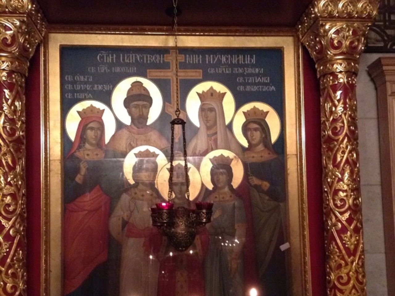 Внутри — богатое убранство. На иконах — убиенные император Николай II с супругой Александрой Феодоровной и детьми.