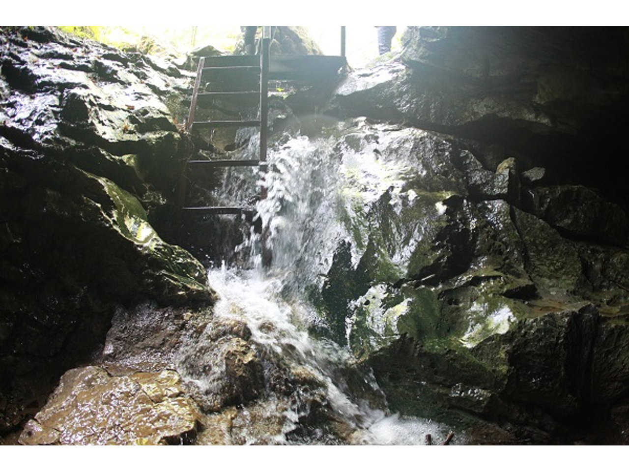 Сама пещера очень влажная. Приходится идти прямо по реке, которая то появляется на поверхности, то уходит под землю. В пещере не очень холодно, градусов 14. Но лучше взять с собой перчатки. Часть пути нужно спускаться по железным ступеням, держась за влажные ледяные перила и хватаясь за веревку.
