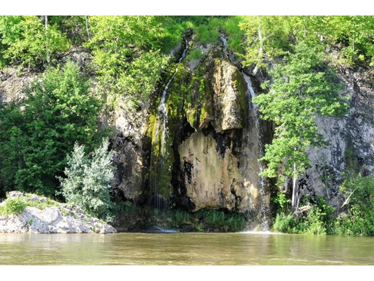 водопаду Зеркальный. Находится он также в Архангельском районе рядом с селом Абзаново. Найти его несложно. Уже на подъезде к реке Инзер в глаза бросается блеск со скалы, расположенной на противоположном берегу. Это и есть знаменитый водопад.