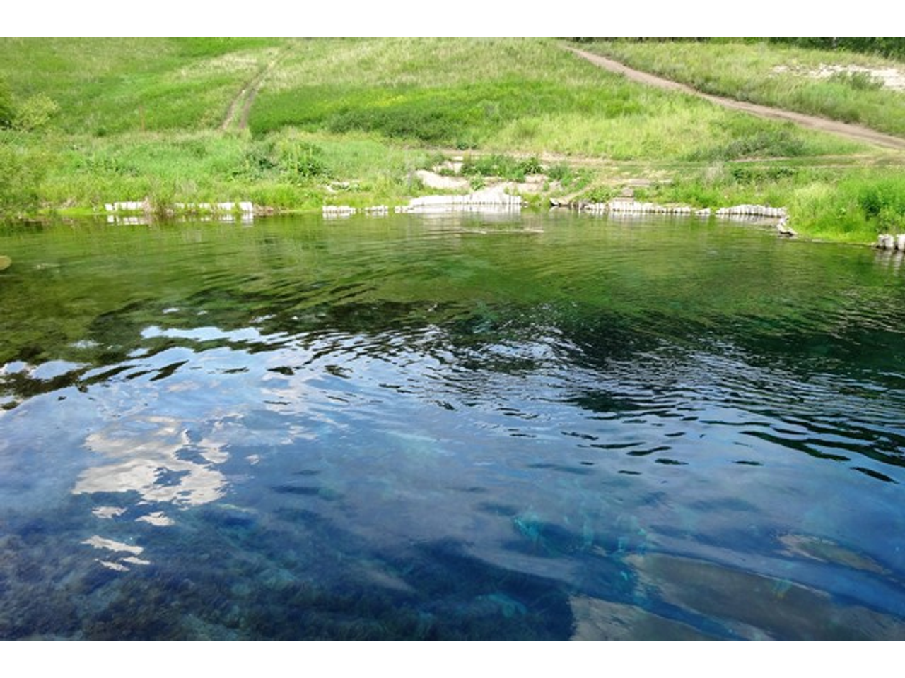 Вода в роднике очень прозрачная, отлично просматривается дно. А еще она имеет красивый бирюзовый оттенок. Интересно наблюдать, как вода из источника сливается с Уфимкой. На поверхности отчетливо видна граница.